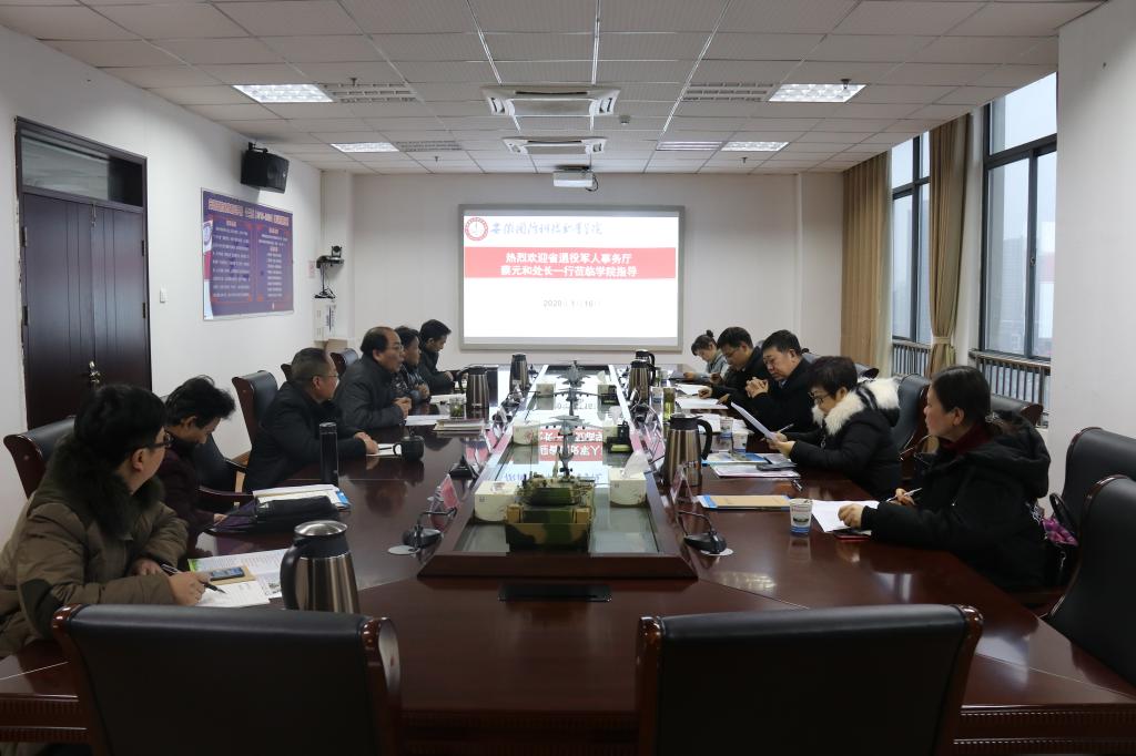 1月16日下午,安徽省退役军人事务厅就业创业处处长蔡元和、副处长钟俊武一行来校调研退役军人高职扩招专项工作。校长李麟书,副校长冯伦久、丁守宝热情接待了来宾并在秉心楼第一会议室召开了调研座谈会。参加座谈调研会的还有相关部门负责人。
