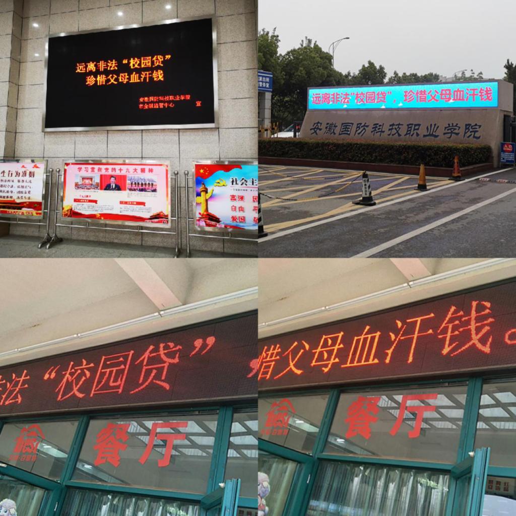 学校大门、综合楼、食堂等处电子屏设置“远离非法‘校园贷',珍惜父母血汗钱”宣传标语