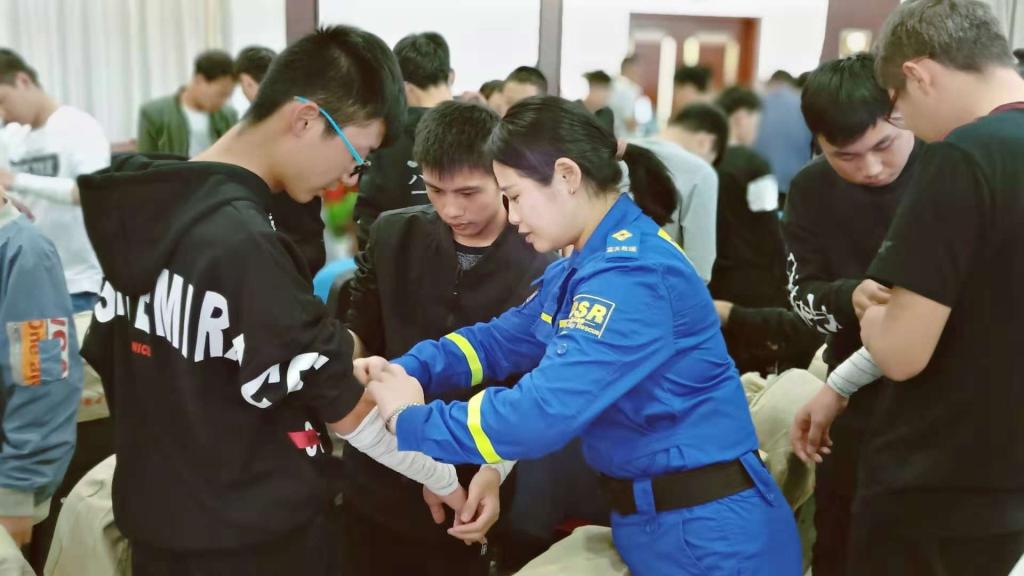 随后,蓝天救援队陶成诚老师结合理论知识和实际救护技巧对应急救护新概念、生活中遇到突发状况、徒手心肺复苏等内容作了详细的讲解。为了使学生更深入的了解外伤止血包扎的各项技巧,掌握心肺复苏要领,陶成诚老师和学生在现场展开了深入互动。对外伤止血包扎技术进行现场演示培训,对心肺复苏进行了实操演练,手把手向学生传授急救手法和注意事项,通过演示和互动学生们更深刻认识到在遇到紧急情况和灾难时,该如何展开自救互救,救助过程中应注意急救的黄金时间及急救的生命链。