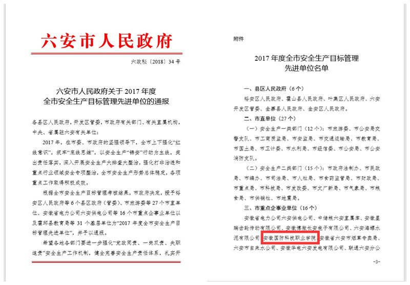 荣获六安市2017年度六安市安全生产工作先进单位