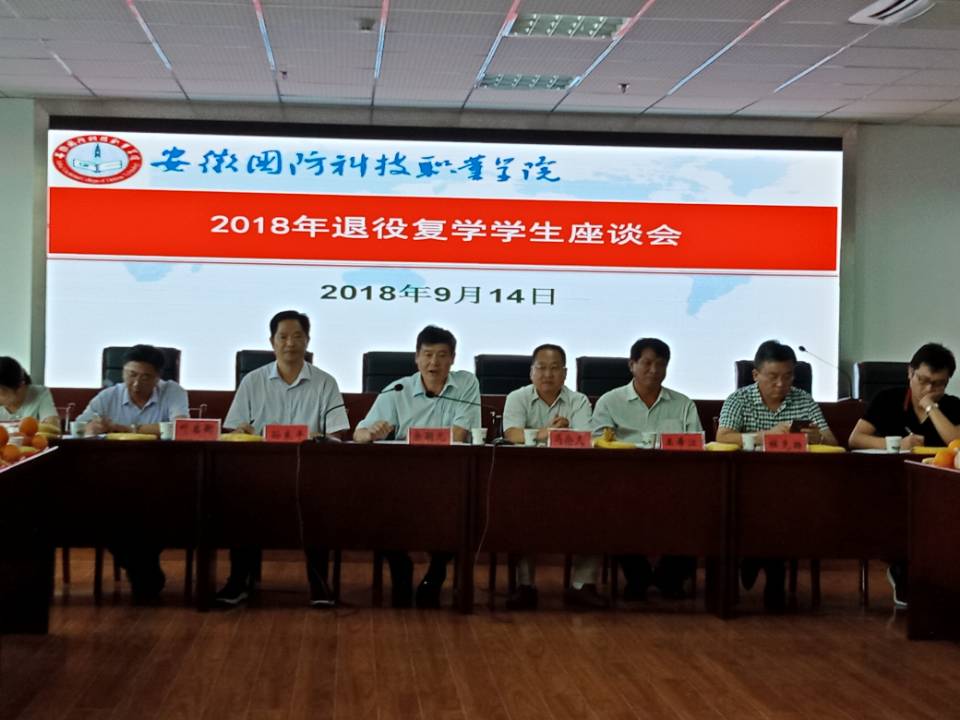 9月14日下午,学校于综合楼12楼会议室组织召开 “永葆军人本色、退伍不褪色”为主题的2018年退役复学学生座谈会。校党委书记余嗣元,党委委员、副校长冯伦久,各二级学院党总支书记,人武部全体工作人员及2018年所有退役复学学生参加了座谈会,会议由人武部长孙良平主持。