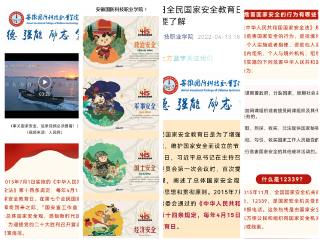 此外,为进一步强化国家安全教育日宣教工作,各二级学院团总支积极组织各班团支部开展了以“维护国家安全,从你我做起”的班级线上主题团日活动,深入宣传了贯彻了习近平总书记关于总体国家安全观和国家安全工作的重要论述、宪法规定关于公民维护祖国安全荣誉和利益的基本义务、国家安全法、反分裂国家法、国防法、网络安全法等。