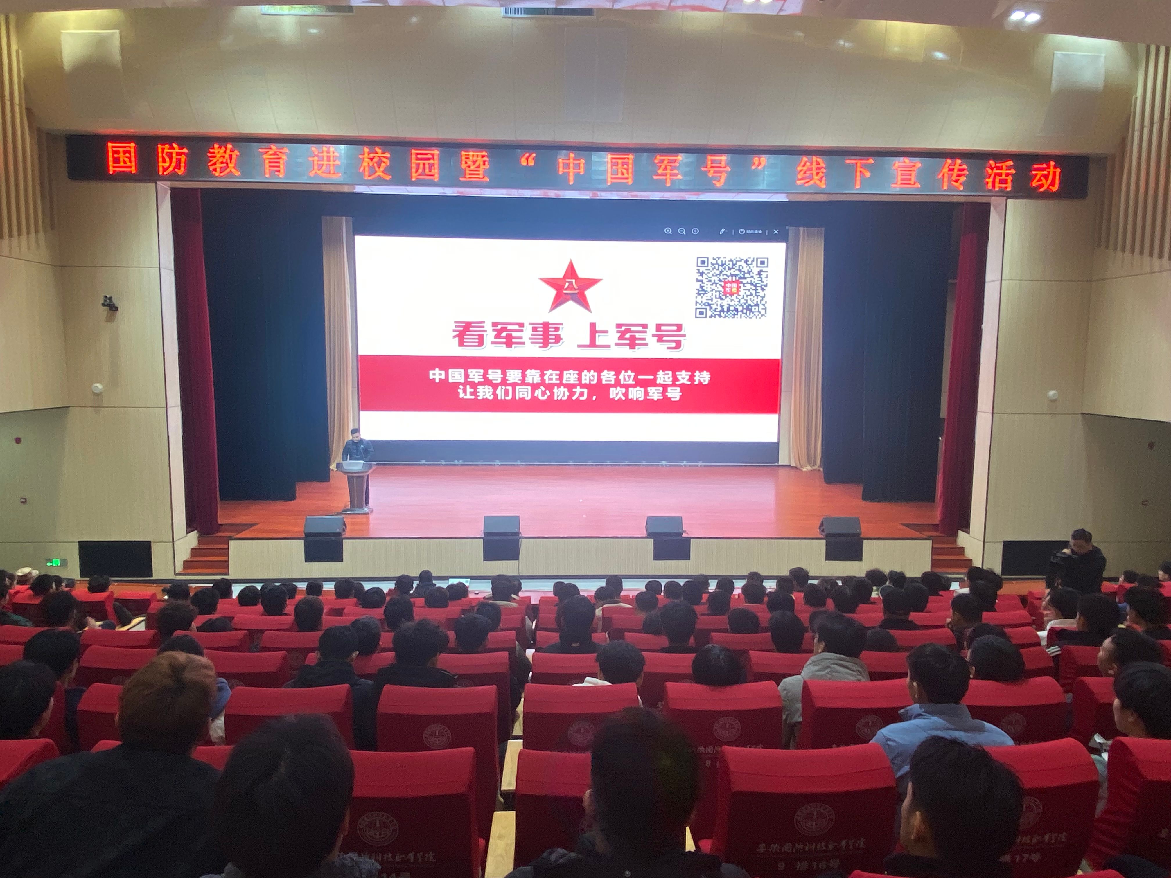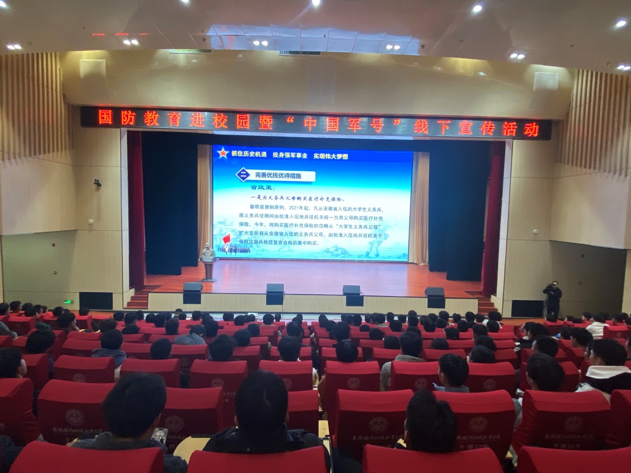 11月15日晚,学校学工部联合六安军分区在校产教融合中心多功能报告厅举办了国防教育进校园暨中国军号线下宣传活动,六安军分区政治处主任胡忠喜、学校学生工作部(处)部长孙武、六安市金安区人武部副部长徐宝军、解放军新闻传播中心记者汤伟、各二级学院有入伍意向学生及大学生退役军人协会成员等500余人参加了活动。