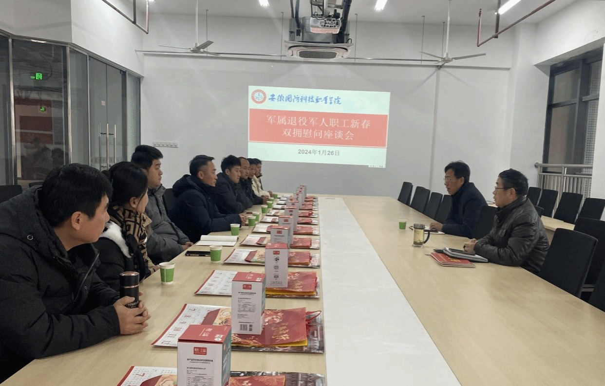 为深入学习贯彻党的二十大精神和习近平总书记关于双拥工作的重要指示精神,大力弘扬拥军优属、拥政爱民光荣传统,营造浓厚双拥氛围,1月25日上午,学校在产教融合中心三楼会议室召开2024年春节双拥慰问座谈会。校党委委员、副校长袁旗,人武部部长孙武、现役军属、退役军人教职工参加座谈会。