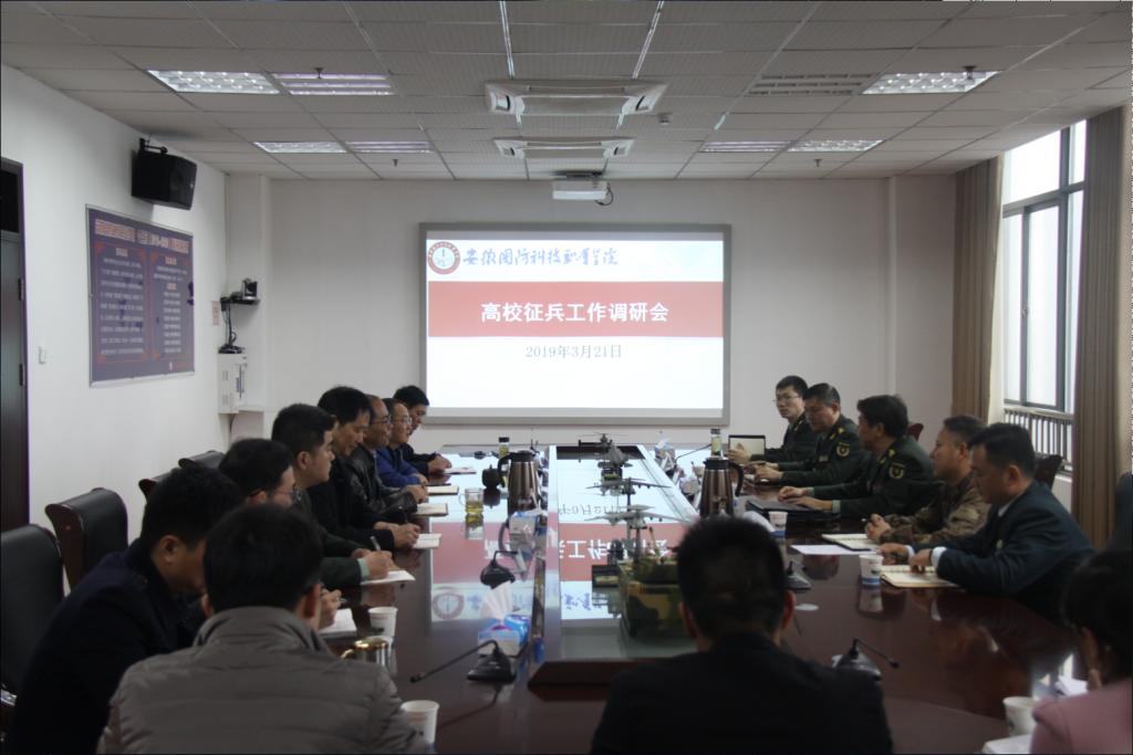 3月21日上午,六安军分区副司令员赵克信、动员处处长王培喜、金安区人武部部长王健、军事科科长马强一行来beat365开展高校征兵工作调研。校长、校征兵工作领导组组长李麟书,副校长、校征兵工作领导组副组长冯伦久,校人武部长孙良平、校人武部副部长韩纪平、校征兵工作站有关负责人、二级学院辅导员及学生代表参加了调研座谈会。