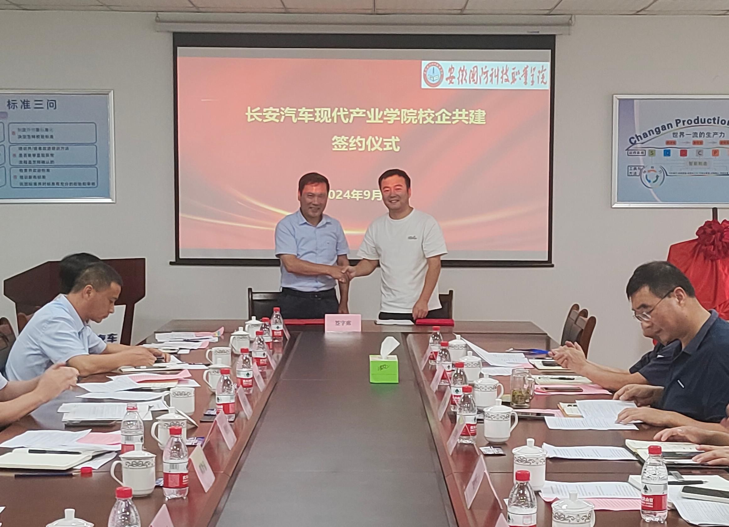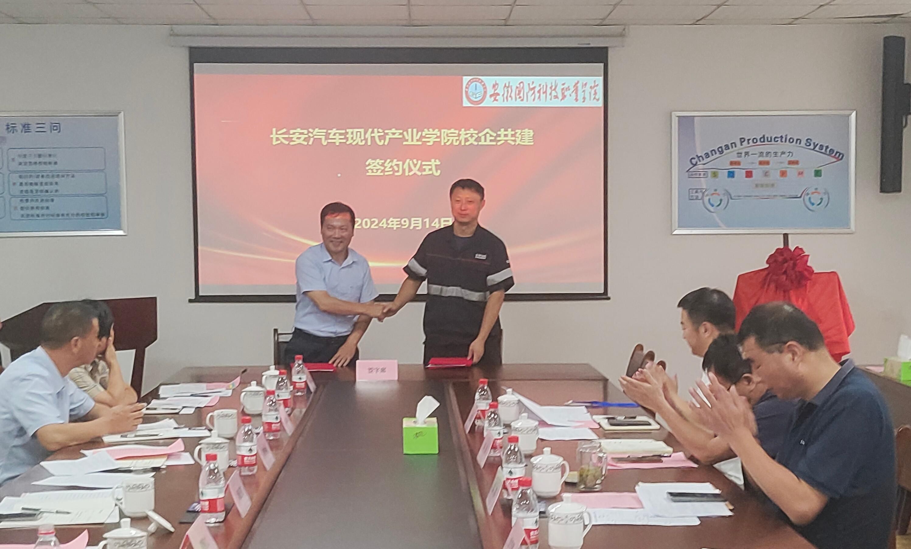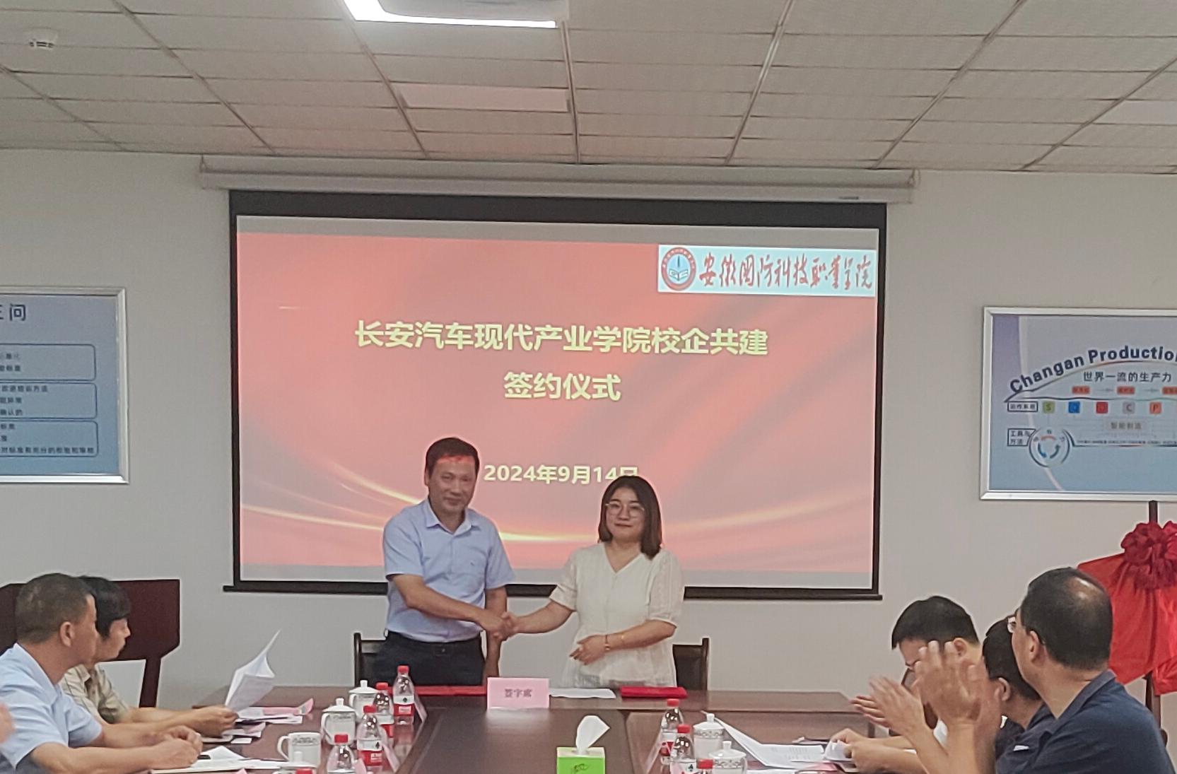 学校与合肥长安、合肥至信、安徽强龙签订《长安汽车现代产业学院校企共建合作办学协议》