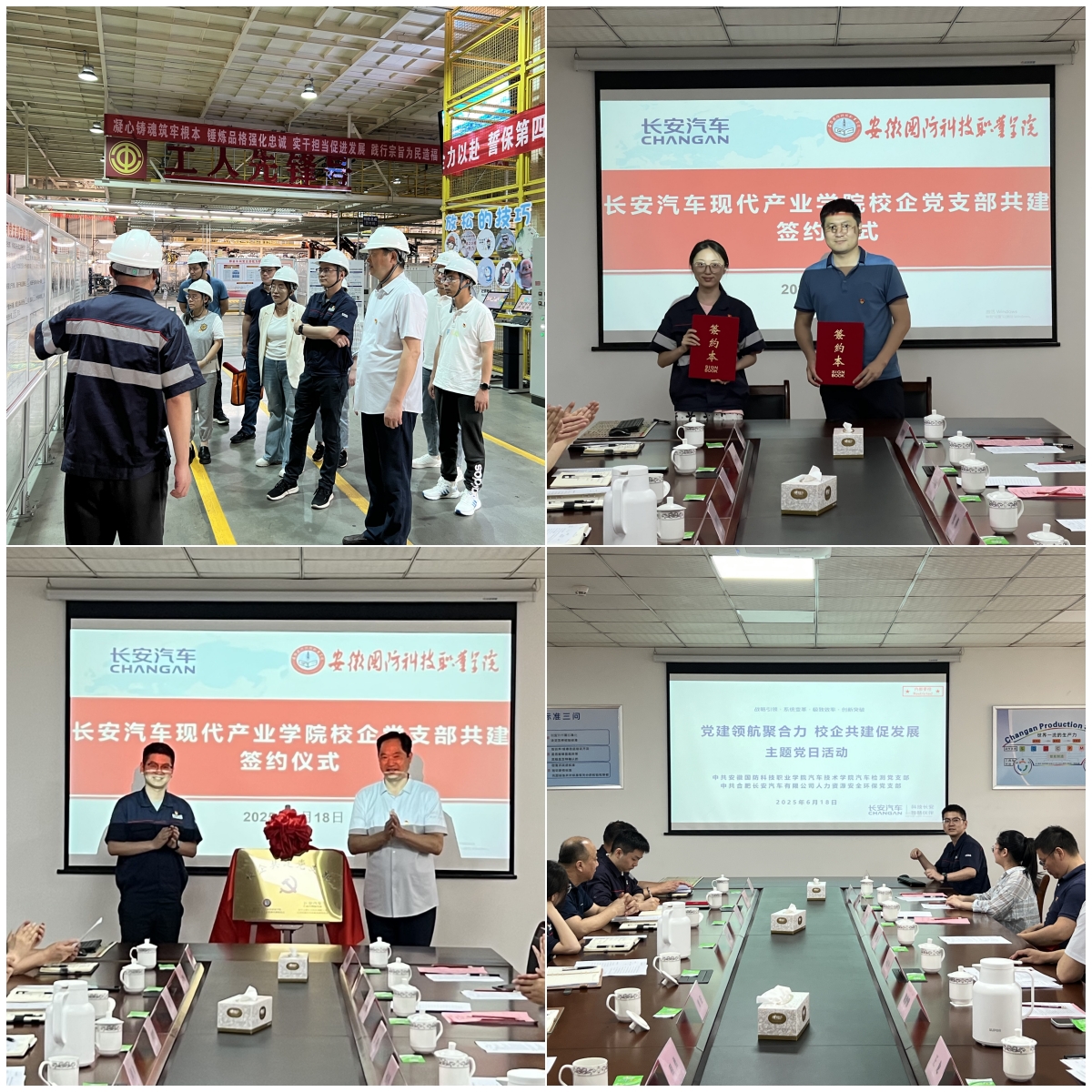 会上,汽车检测党支部与人力资源安全环保党支部签订了《校企共建党支部》协议书,双方领导共同进行了校企共建党支部、长安汽车现代产业学院教师实践工作站、企业教师流动站揭牌,孙良平代表学院为安徽省产业教授程勇,安徽省劳模、技能大师许刚、王俊峰颁发了兼职辅导员聘书,充分彰显企业技术专家深度融合校企合作的积极作用。