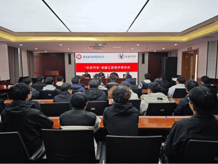 本网讯(汽车技术学院 张洋洋)为深化产教融合、推进校企协同育人,赋能专业群高质量建设与教育教学改革落地见效,12月3日下午,汽车技术学院2025级“长安汽车”卓越工匠班开班仪式于产教融合第二报告厅圆满举行。合肥长安汽车有限公司人力资源处主管袁华明、招聘专员叶梅应邀出席;汽车技术学院副院长(主持工作)姜继文、党总支副书记陈梦雅及工匠班全体新生共同参会,仪式由陈梦雅主持。