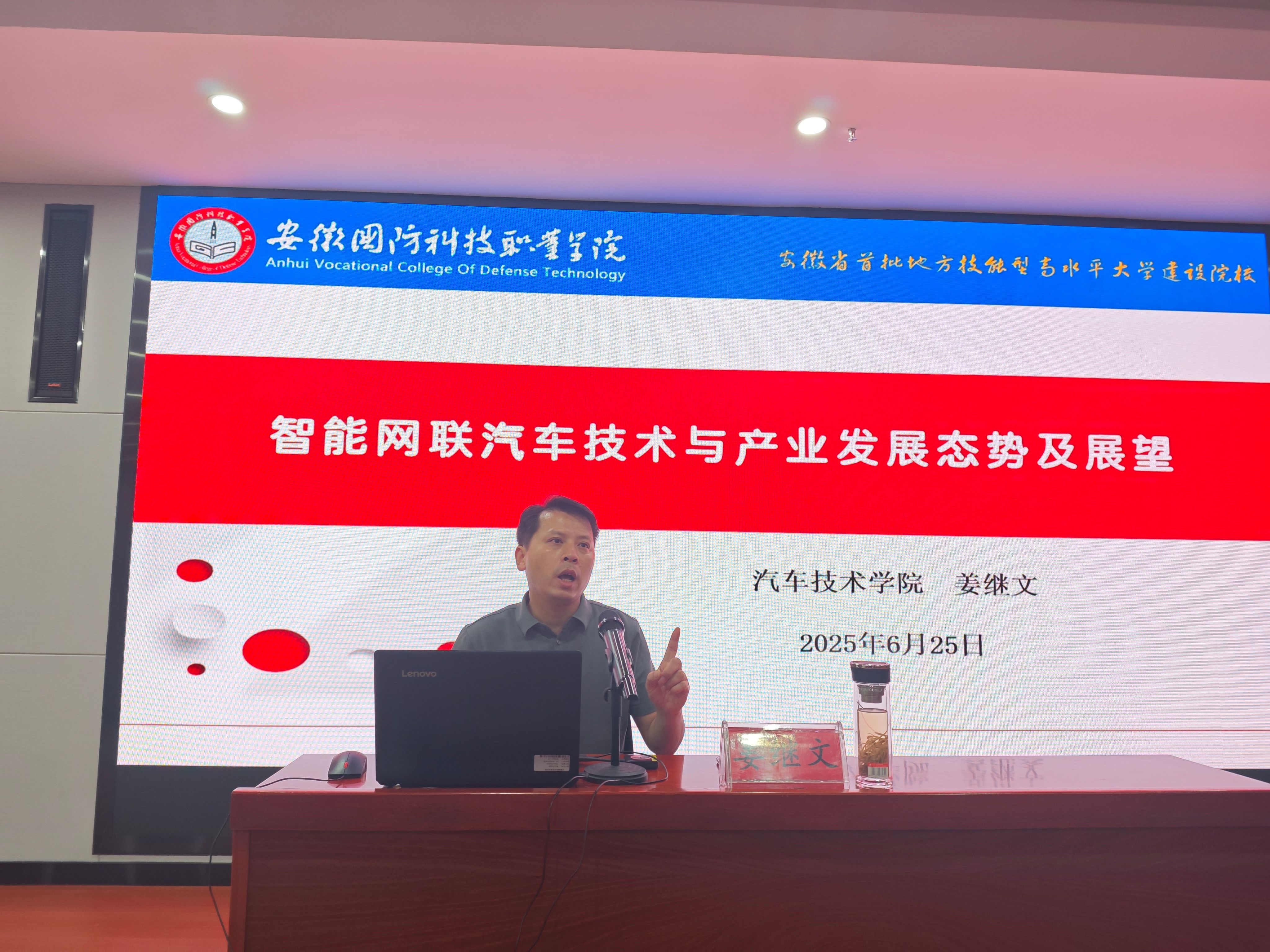 为拓宽师生专业视野、明晰产业技术前沿,助力专业建设与人才培养精准对接行业需求,6月25日下午,汽车技术学院于产教融合第一报告厅成功举办 “智能网联汽车技术与产业发展态势及展望”学术讲座。本次讲座由学院副教授、高级实验师、校级新能源汽车技术专业负责人姜继文担任主讲,学院全体教师及2024级新能源汽车技术、智能网联汽车技术专业学生代表到场聆听,讲座由叶兴姚主持。