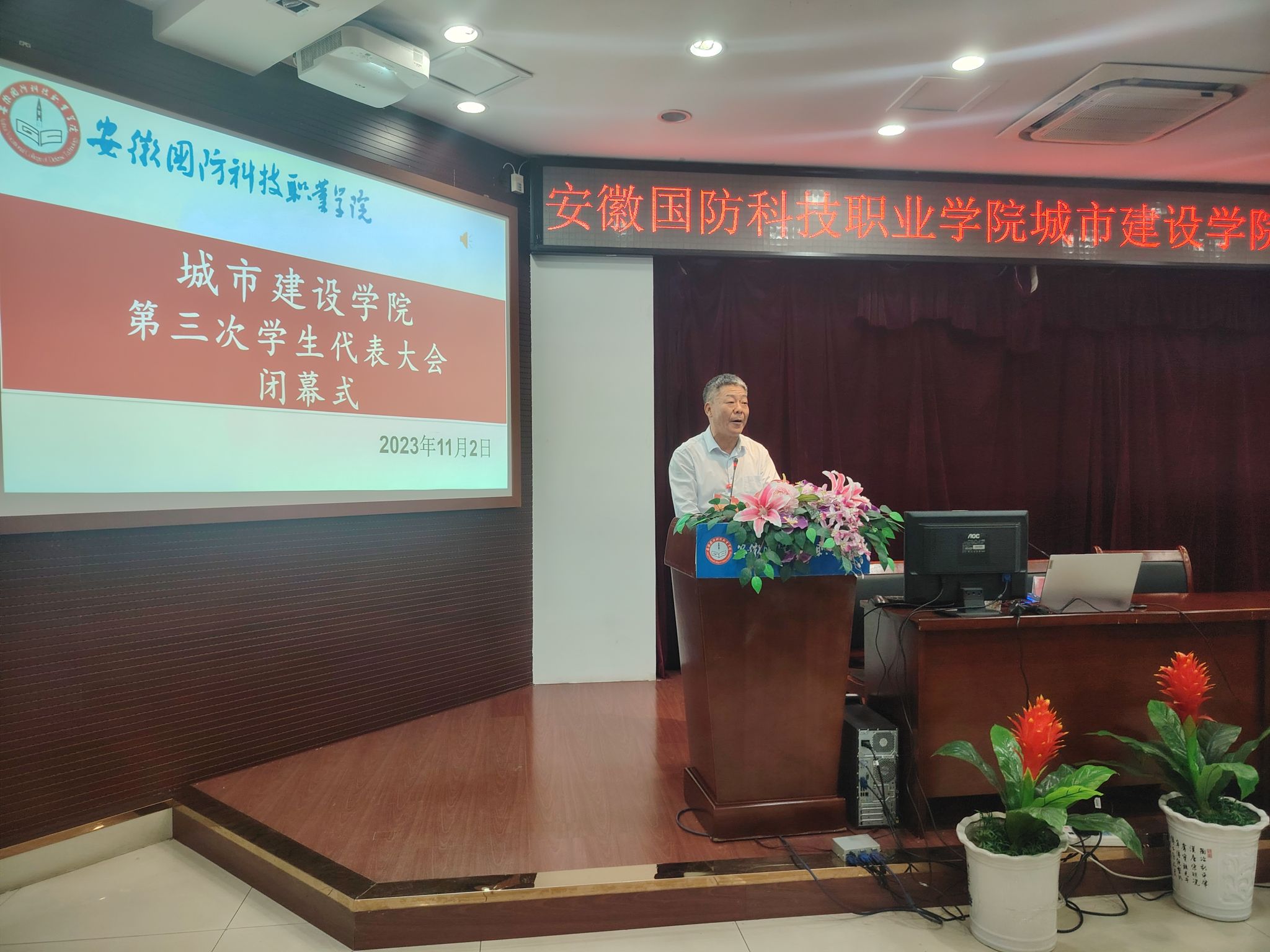 大会闭幕式上学院党总支书记张宗江致闭幕词。首先,张宗江书记认为此次大会是在全面贯彻落实党的二十大精神,开启第二个百年奋斗目标的新征程上和学校“双高校”建设的关键时期召开的一次十分重要的会议。随后,张宗江肯定了城市建设学院学生会在学院党总支和校团委的正确领导和关心爱护下近年来所取得的成绩,并对新一届学生会提出了三点希望,一是全体学生干部要积极支持新当选的学生会干部的工作,多沟通多交流,搞好团结;二是发挥好带头作用,严格遵守学校的规章制度;三是新当选的学生会主席团、执行主席要尽快进入角色,在学院团总支的指导下不断加强学生会组织建设和学生干部队伍建设,团结带领全体青年学子再创学院团学工作新的辉煌!
