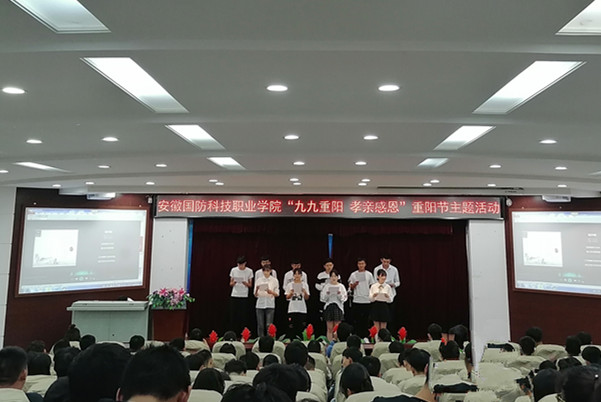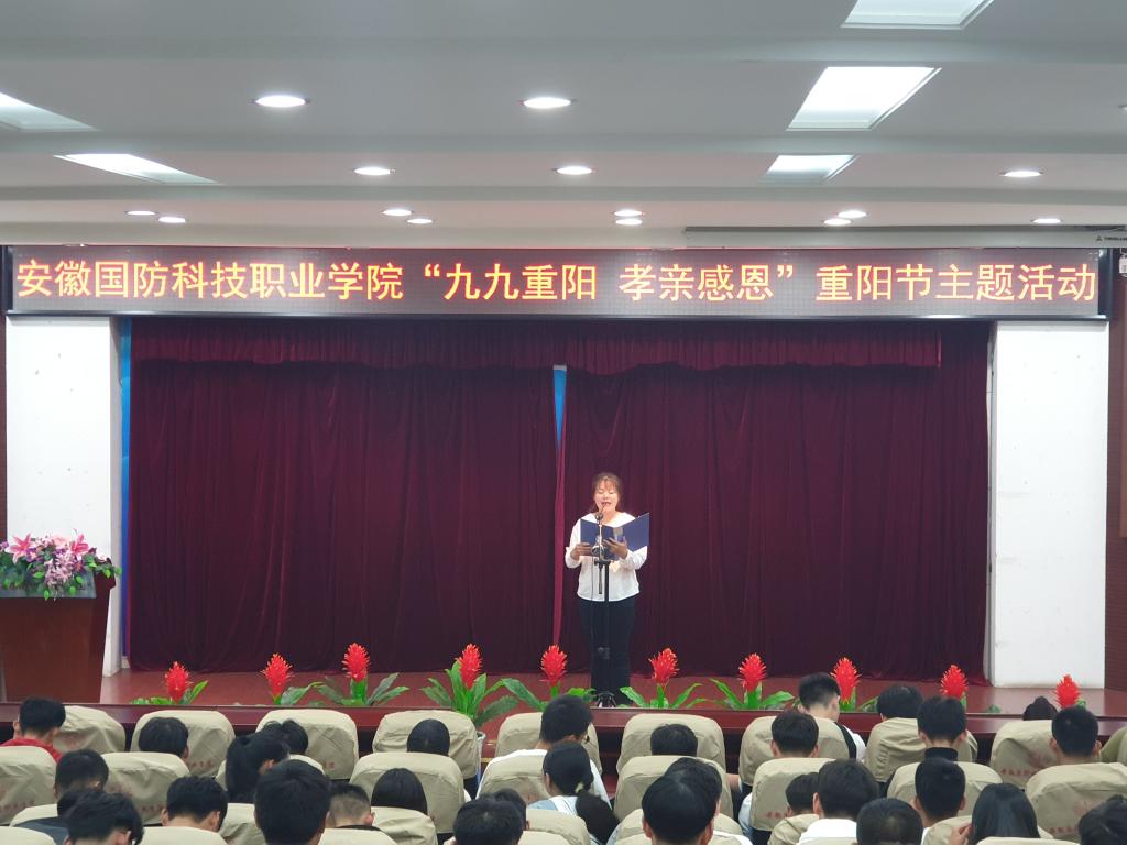 同学们以饱满的热情、悦耳的歌声向老师们、同学们展示出青春的风采,唱出对父母长辈的感恩。参会人员集体观看了视频《关爱老人,关爱父母》,视频中真挚感人的故事让人动容,全体参会人员进一步加深了对“感恩”内涵的理解。接着,由各二级学院推荐3名学生参加重阳节诗歌朗诵大会,他们分别以关注重阳、孝亲敬老、感恩情怀为主题,朗诵了他们自己选出的诗歌,《重阳.献给妈妈的歌》、《采桑子·重阳》、《尊老敬老,学会感恩》、《岁岁重阳,今又重阳》…学生们诵读风格各异,有的生动活泼,有的深情吟咏,有的顿挫有力。不一的风格,却共同展现着中华文化的深厚底蕴与魅力,传承着炎黄子孙登高望远、敬老爱友、孝亲感恩的古老传统。