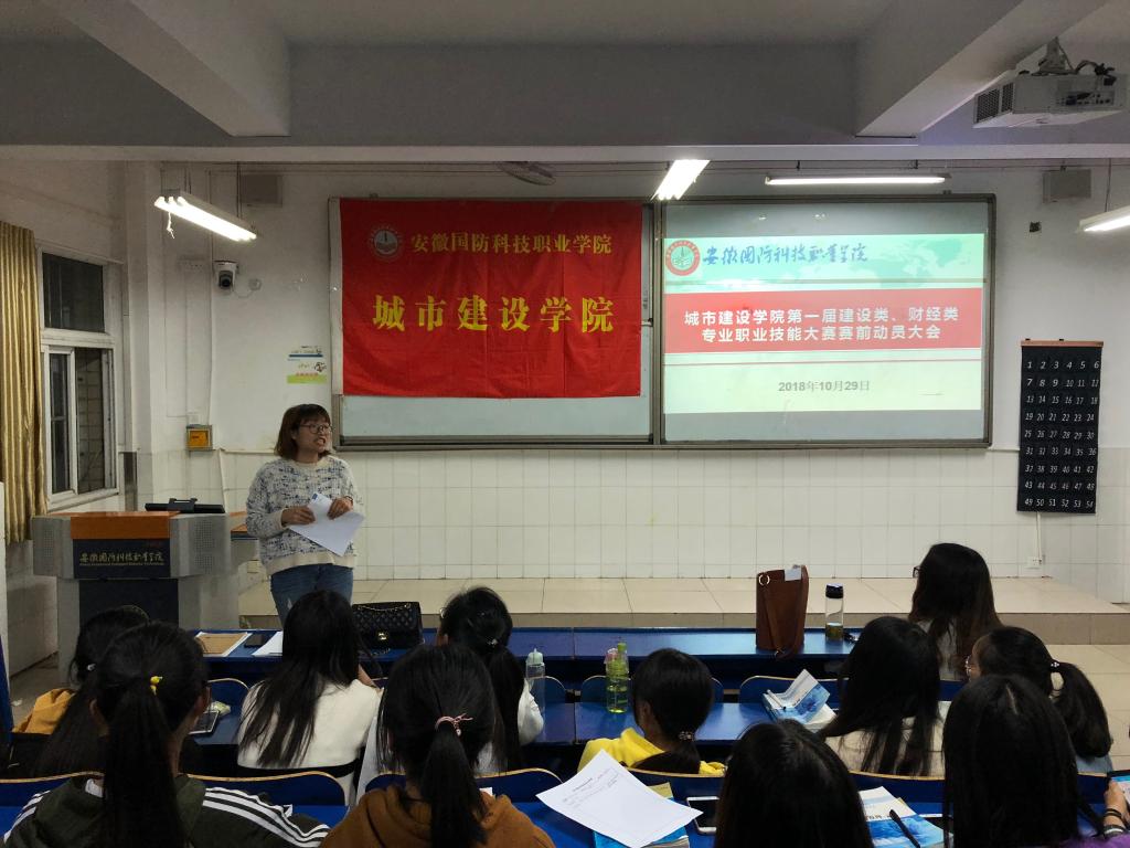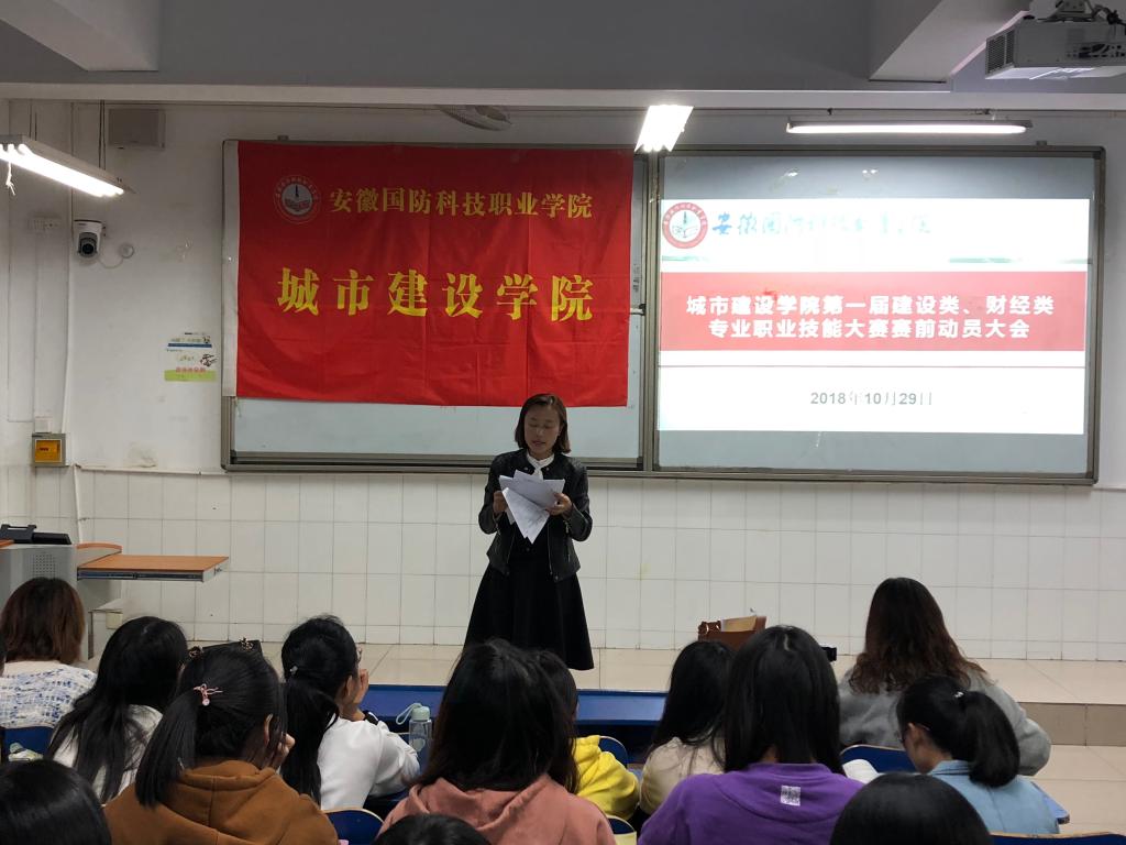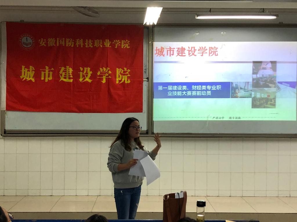 张凤老师带领大家学习了关于学院举办第一届建设类、财经类专业职业技能大赛的通知文件,表示此次举办校级职业技能大赛是为2019年举办的省级技能大赛预选出种子选手,力争在省级技能大赛中取得好成绩。