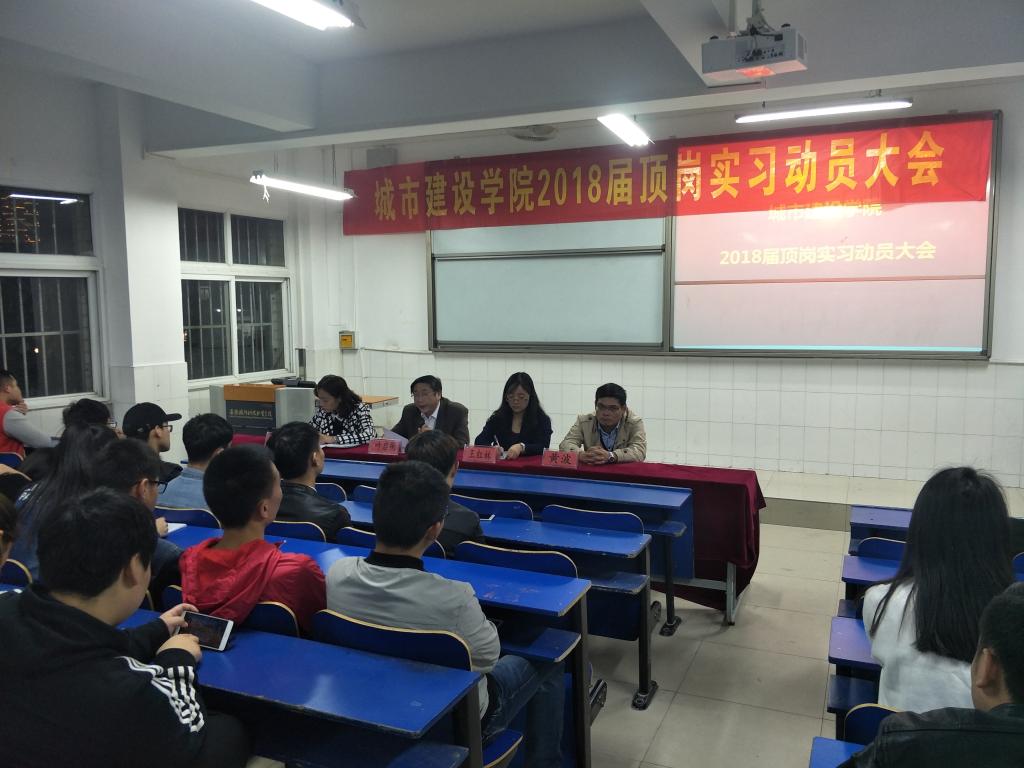 2017年10月17日,城市建设学院召开2018届毕业生顶岗实习动员大会。城市建设学院党总支副书记叶启衡、副院长王红林、办公室主任黄波、综合素质拓展中心主任雷雨、城市建设学院团委书记张凤以及各毕业班级班主任、辅导员参加会议。会议由张凤主持。叶启衡书记作了《2018届毕业生顶岗实习动员会讲话》,讲话中强调了顶岗实习的重要性和必要性,要求同学们要充分认识到顶岗实习的重要意义,并对同学们提出了要求,希望同学们首先要确保安全,然后能够克服困难,出色的完成顶岗实习,锻炼自己为校争光。最后,结合幻灯片,综合素质拓展中心主任雷雨给大家解读了顶岗实习的相关内容和准备材料,把即将而来的双选会信息给大家作了介绍,并让学生们现场提问尽可能的为学生解答疑问。
