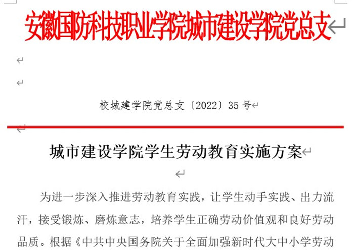 为贯彻落实《中共中央国务院关于全面加强新时代大中小学劳动教育的意见》的文件精神,进一步深入推进大学生劳动实践教育,培养大学生正确劳动价值观和良好劳动品质,城市建设学院根据校教函(2022)134号《关于设立劳动教育实践基地的通知》文件要求,制定了《城市建设学院学生劳动教育实施方案》。
