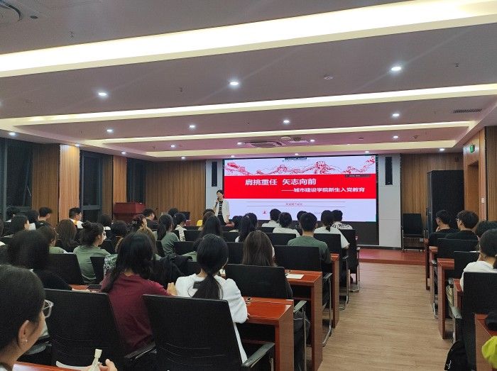 9月12日晚,城市建设学院党总支副书记叶高洁从时代的号角在响动和担当时代重任,建功立业新时代两个方面为新生开展入党教育活动。叶高洁用漫画短片给大家生动地介绍了中国共产党和入党流程。叶高洁嘱咐广大青年学生,要坚定理想信念,不断学习,磨炼自身意志,时刻胸怀祖国,谨记心系群众。