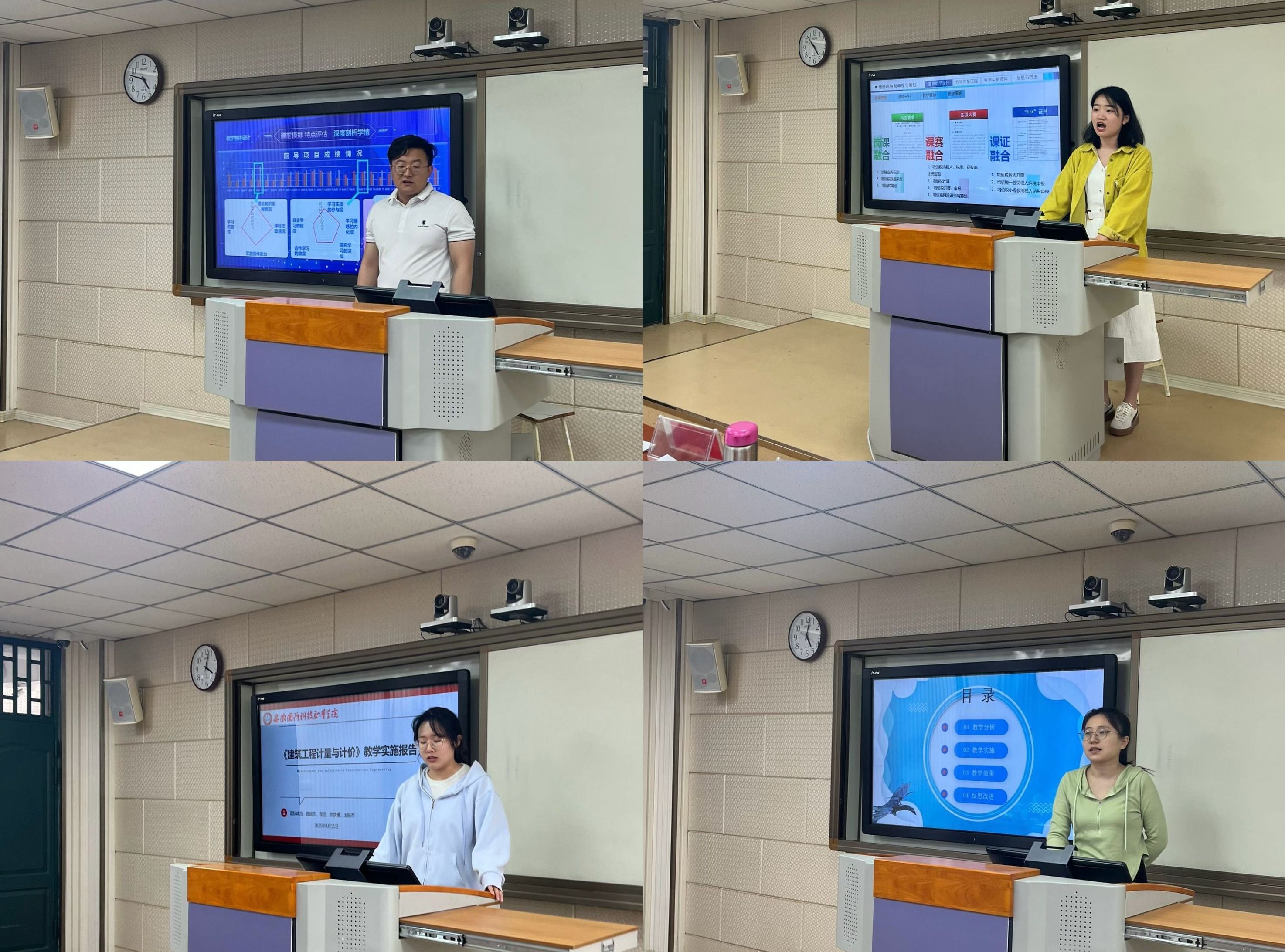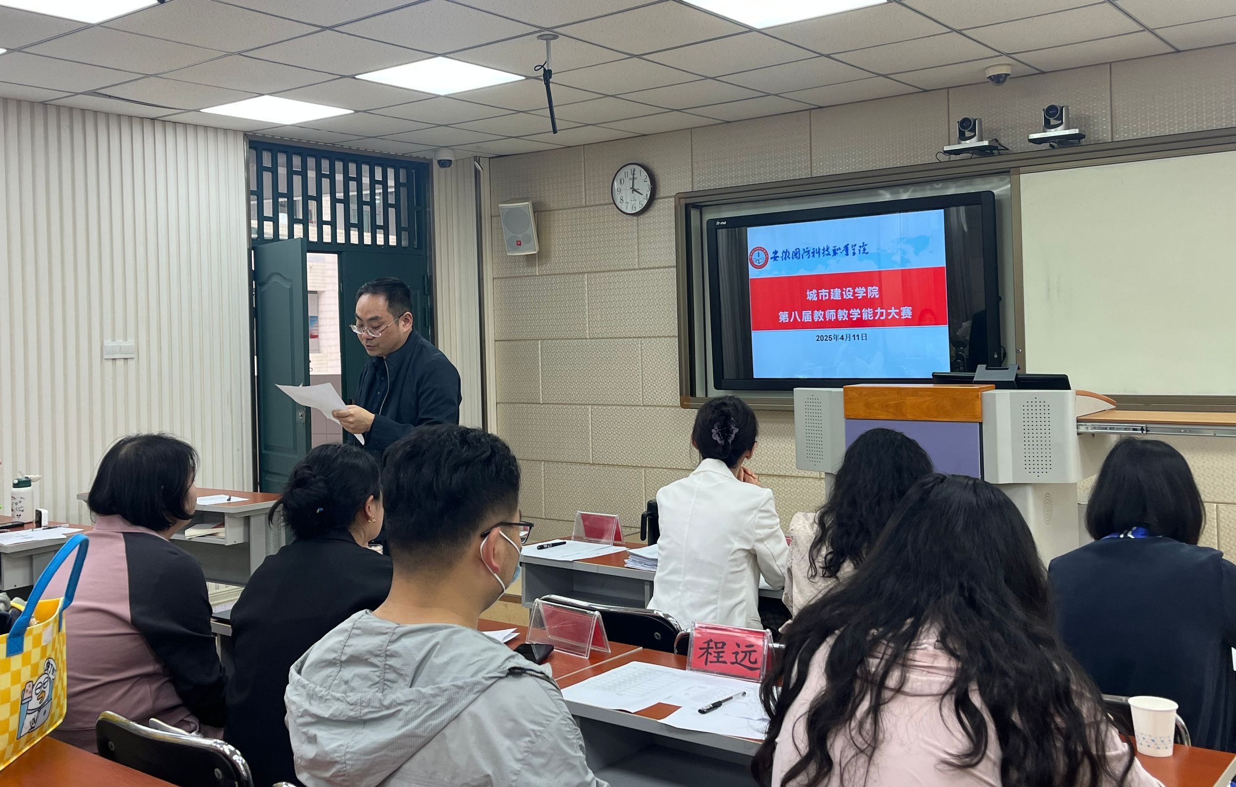本网讯 (城市建设学院 高烨)为落实职业教育国家教学标准和课程思政要求,持续深化教师、教材、教法改革和教育数字化转型发展,推进高水平、结构化教师教学创新团队建设,弘扬教育家精神,促进“能说会做善导”的“双师型”教师成长,不断提高教师的师德践行能力、专业教学能力、数字素养水平、综合育人能力和自主发展能力,促进学生全面发展、技能成才,我院依据学校关于教学能力大赛工作的计划和要求,统筹策划学院教师教学能力大赛。4月12日下午,我院在2教206智慧教室举行第八届教师教学能力大赛。大赛由学院副院长左飞主持,学院全体教师积极参与。