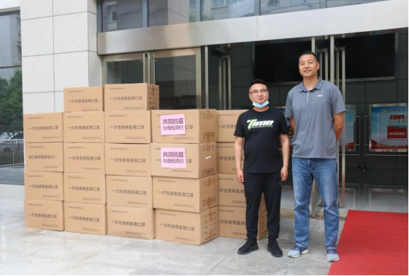 优秀校友马竞成(左)为母校捐赠6万只口罩