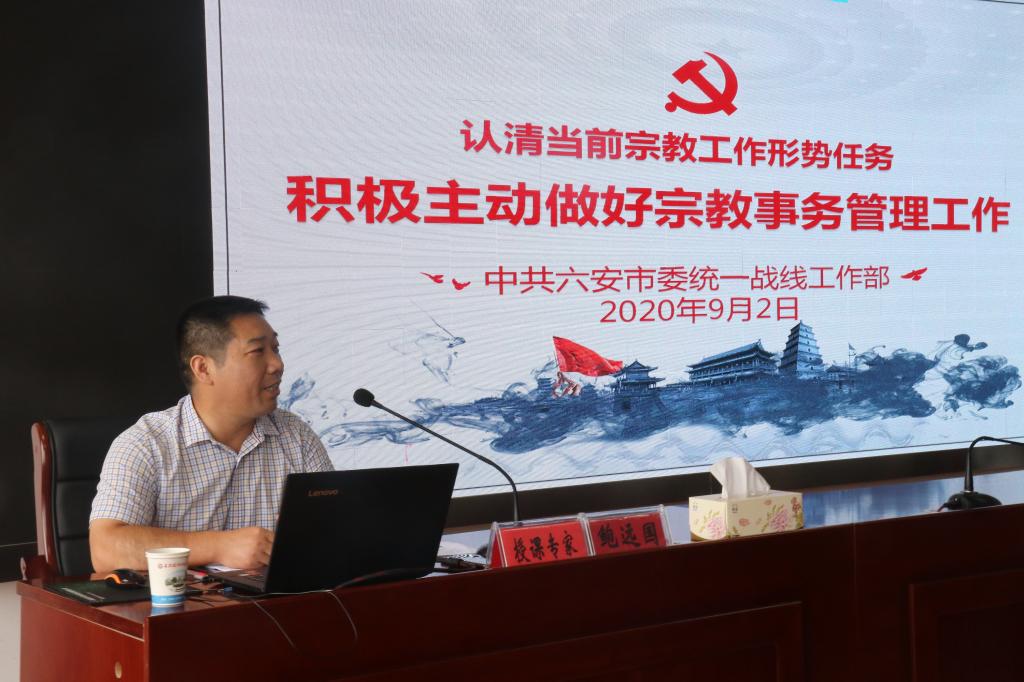 六安市委统战部宗教政策法规科科长鲍远国作《认清当前宗教工作形势任务,积极主动做好宗教事务管理工作》专题报告。他从当前宗教工作基本形势和任务、各宗教领域存在的突出问题、积极主动做好宗教工作等方面对宗教工作做了详细的讲解,用一个个鲜活的案例深度分析了宗教工作的重要性和必要性。