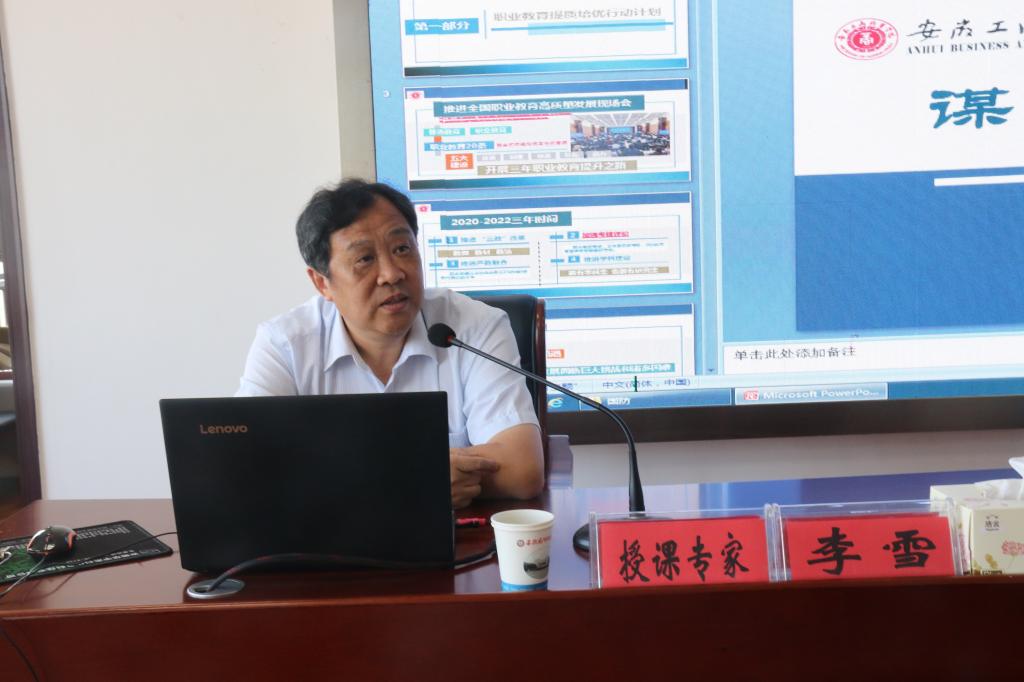 安徽工商职业学院院长、教授,国家级教学团队带头人,安徽省高等学校省级教学名师李雪作《提质培优 增值赋能,谋划“十四五”改革新篇章》专题报告。他从职业教育提质培优行动计划和谋划“十四五”改革新篇着力质量与治理提升两部分做了细致讲解。报告信息量大,指导性和针对性强,为学校谋划“十四五”改革指明了方向和路径。