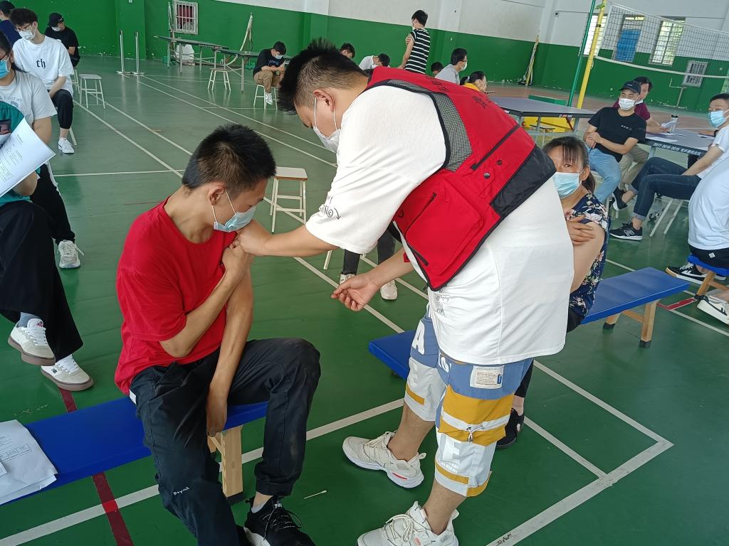 体育馆内,不管是在进口还是出口,登记、接种、留观等不同区域都有身穿红马甲志愿者们的身影,他们协助医护人员引导前来接种的师生按照接种点标识有序排队,保持安全距离。红马甲们一站就是一天,一个手势的指引,一个及时的提醒,一个暖心的帮助,让接种现场井然有序。