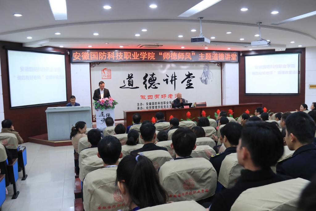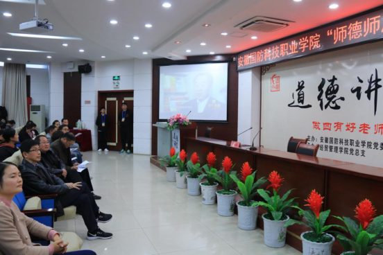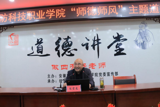 为深入学习贯彻全国教育大会精神特别是习近平总书记关于教育的重要论述精神,加强学校师德师风建设,11月28日下午,由校党委宣传部主办,经贸管理学院党总支承办的“师德师风”主题道德讲堂在图书馆报告厅隆重举行。特邀合肥师范学院教授陈宏友做主题报告,校领导朱德明、冯伦久出席,中层干部、思政课教师及各二级学院师生代表共200余人参加了此次活动,活动由经贸管理学院党总支副书记刘峰主持。
