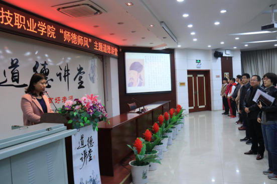 第四个环节,诵一段经典。在经贸管理学院杨懿老师的带领下,全体师生起立齐声吟诵韩愈名篇《师说》选段,“师者,所以传道受业解惑也......”千古名句流传至今,也将中华民族优良的师德师风传承至今。
