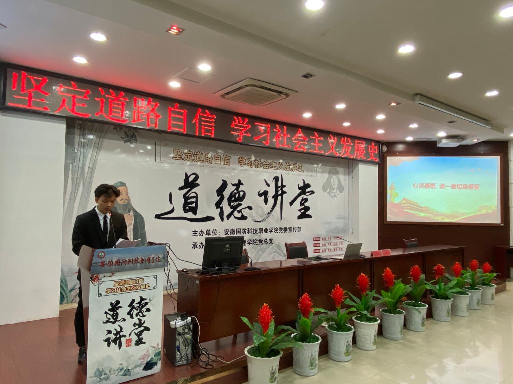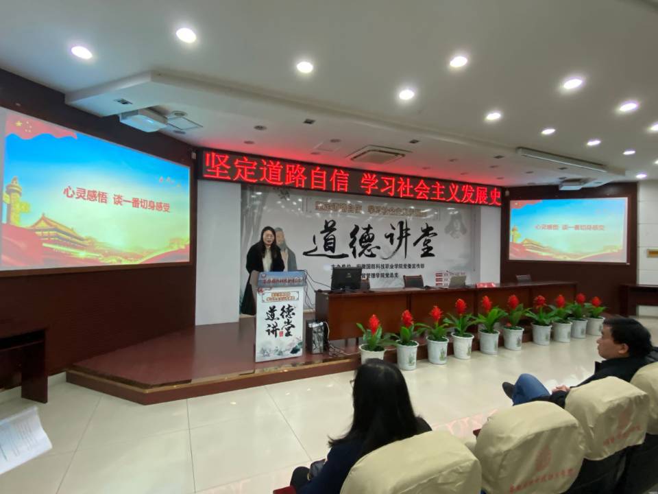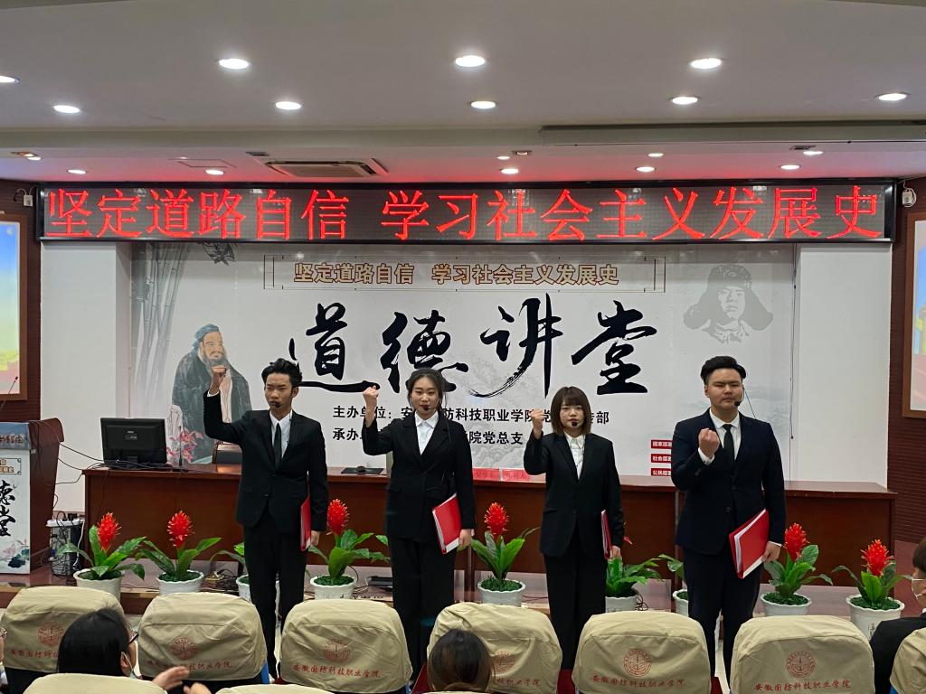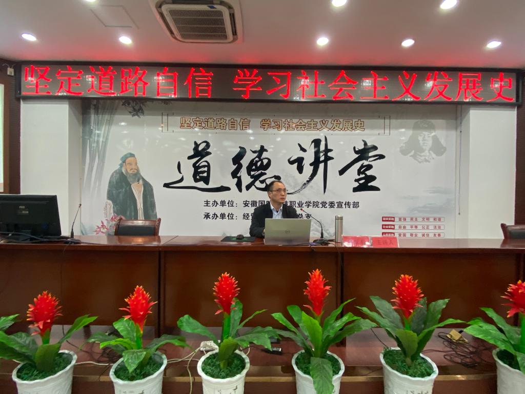 本网讯(经贸管理学院 付玉梅)为深入学习贯彻党的十九届六中全会精神及省第十一次党代会精神,积极培育和践行社会主义核心价值观,全面加强全校师生的思想道德建设,大力弘扬中华民族优秀传统文化,12月15日,由校党委宣传部主办、经贸管理学院党总支承办的“坚定道路自信 学习社会主义发展史”主题道德讲堂活动在图书馆报告厅举行。活动邀请皖西学院马克思主义学院院长吴学东教授做专题报告,校党委副书记冯伦久出席活动,近200名师生代表参加,活动由经贸管理学院党总支副书记刘峰主持。
