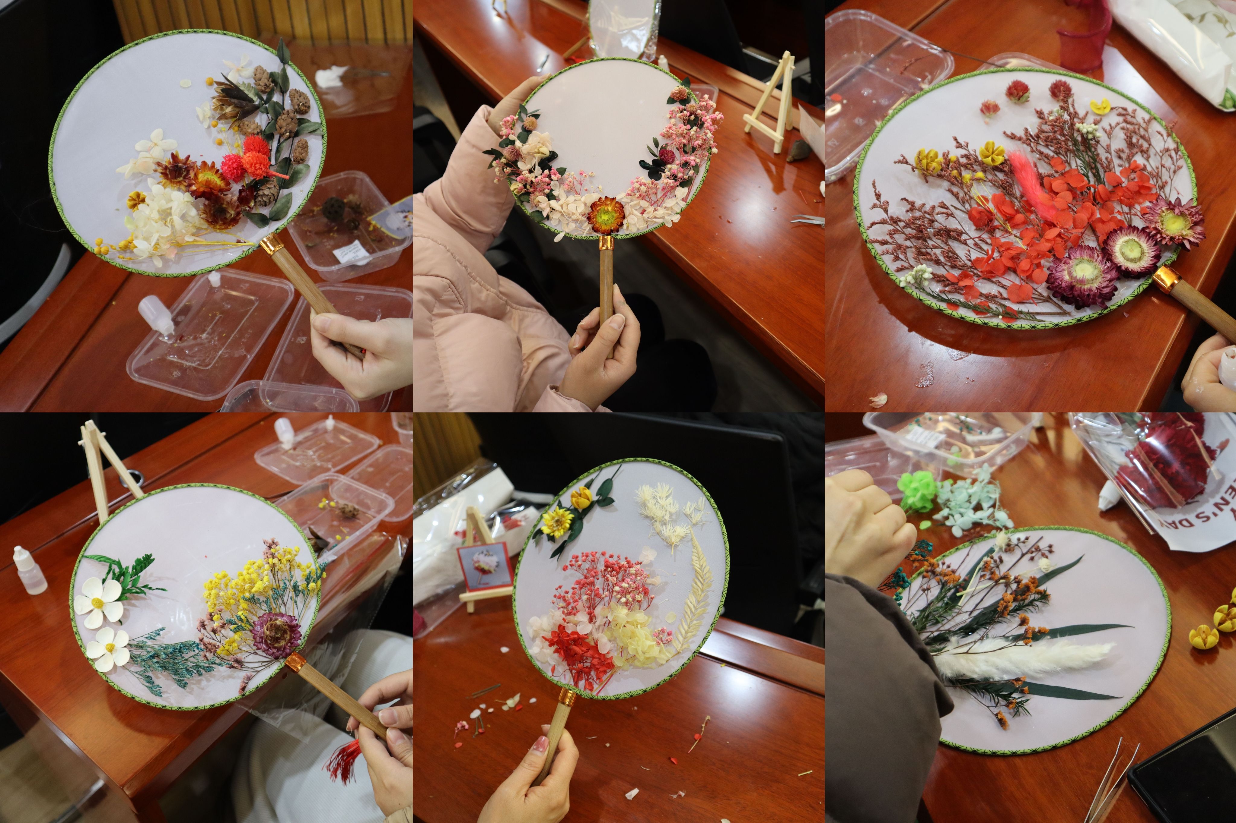 接着,大家在郭艳秋老师的带领下开展了一场干花团扇制作活动。女工委为大家准备好白娟扇、干花、胶水等材料。大家在进行简单地交心后便迫不及待地动起手来,从拼接、剪裁到上胶、固定等,一步一步制作得特别认真,遇到不会的地方,大家互相学习、相互提出建议,在相互的分享中享受制作的过程。
