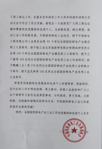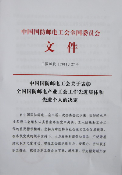 2011年12月,中国国防邮电工会全国委员会下发文件,决定授予王广健等320名同志全国国防邮电产业“优秀工会工作者”荣誉称号,我院党委委员、工会主席李建新同志荣获这一荣誉。