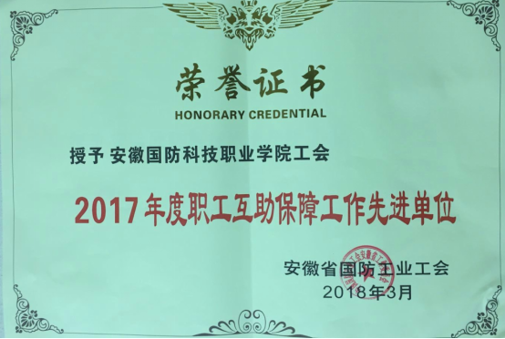 经过考核评比,校工会被省国防工业工会授予“2017年度工会工作先进单位”和“互助保障工作先进单位”的称号。