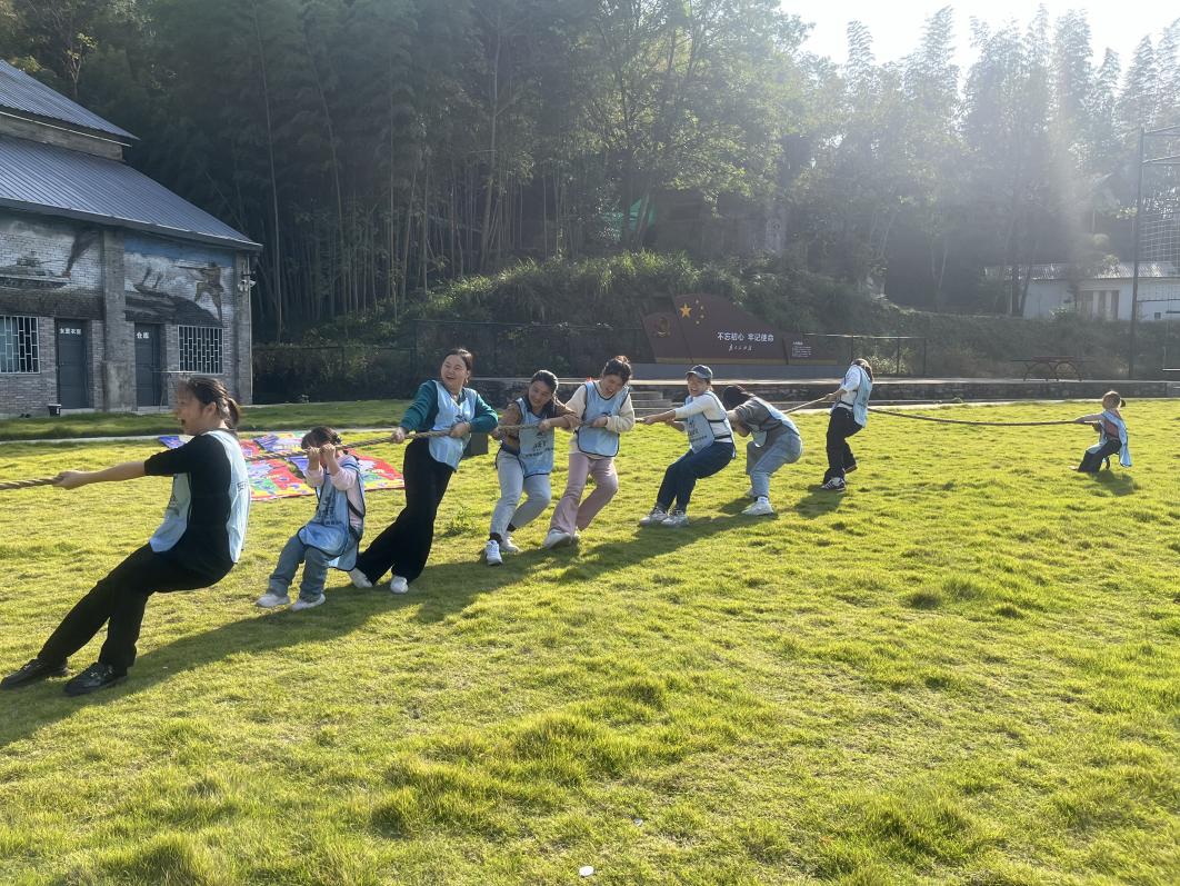 稍作休息后,趣味横生的户外游戏闪亮登场。拔河比赛作为开场游戏,瞬间点燃了现场的气氛。教师们分成2小组,个个摩拳擦掌,眼神中透露出必胜的决心。随着裁判的一声哨响,比赛正式开始。只见大家紧握麻绳,身体后倾,双脚用力蹬地,使出浑身解数,呐喊声、助威声此起彼伏。拔河绳在两队之间来回移动,每一次的僵持和拉扯都扣人心弦,现场气氛紧张而热烈。