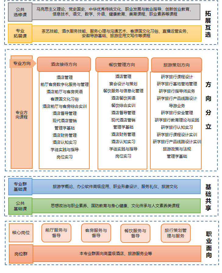 通过贯彻国家指导方针,将改革人才培养模式与促进企业和行业发展相结合,探索出校企联合招生、联合培养、一体化育人的长效人才培养机制 | 学生、企业员工双重身份 | “学生→学徒→准员工→员工”四位一体的培养模式 | 四星级及以上国际化酒店前厅、客房、餐饮、娱乐、康体等业务部门的主管及部门经理为主要就业岗位。 |