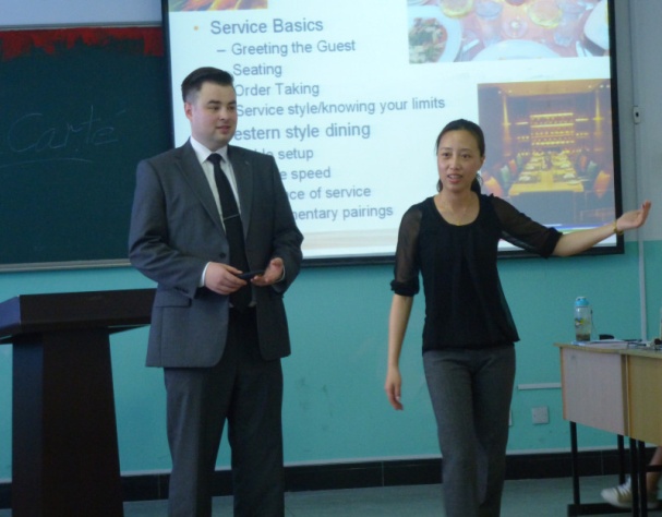 上海扬子江万丽大酒店宴会统筹总监Jane和西餐餐厅经理Michael向同学介绍西餐礼仪