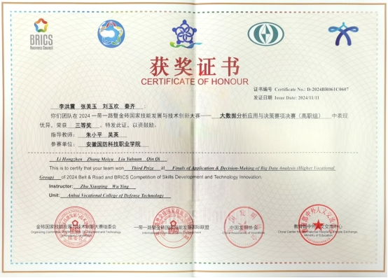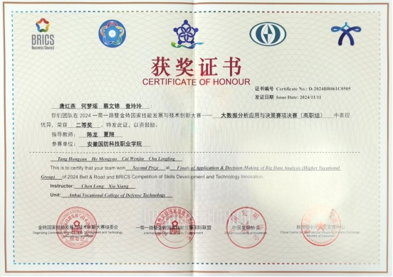 2024年11月9日-10日,第八届“一带一路“暨金砖国家技能发展与技术创新大赛之大数据分析应用与决策赛项(高职组)全国总决赛在辽宁金融职业学院隆重举行,大赛来自全国66所高校、96支参赛队伍、384名参赛选手同台竞技。