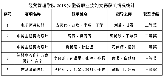 2018年安徽省职业院校技能大赛已经圆满结束,比赛中经贸管理学院五个参赛队在参加的四个赛项上发挥出色,学生面对实力强劲的各参赛院校选手,沉着冷静,全力以赴,充分展示了我院学子的专业技能和竞技风采,最终荣获二等奖3项,三等奖2项。