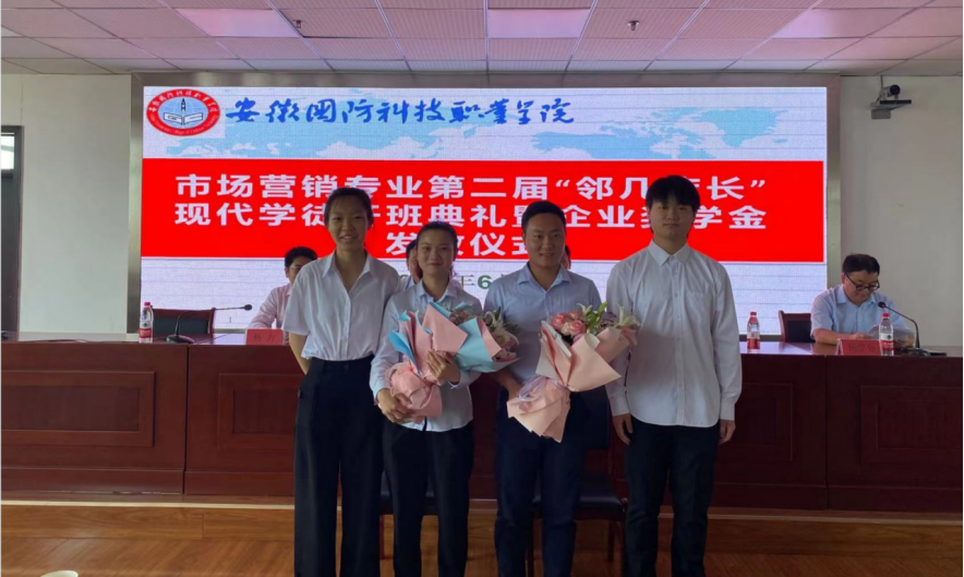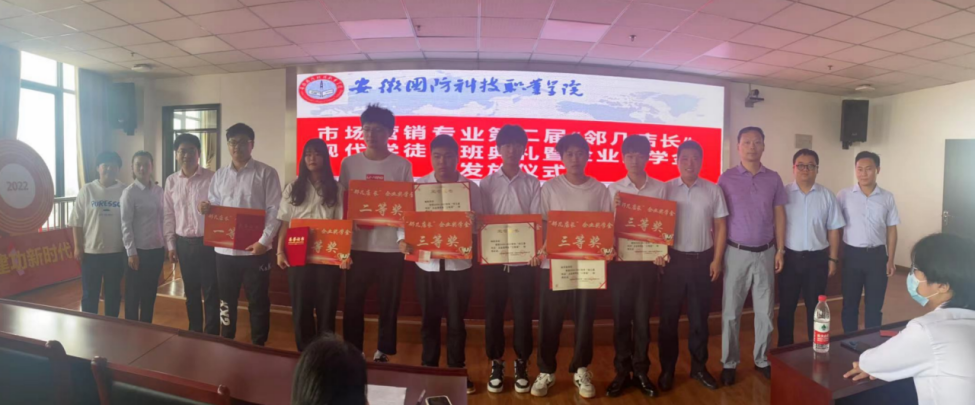 随后,校企领导共同为20级营销学徒班的7位同学颁发企业奖学金和荣誉证书,获奖学生代表20市场营销1班郭文秀发言表示对学校开展学徒制订单班的感谢和认可,并表达了同学们对于接下来进入邻几实习的态度和决心。