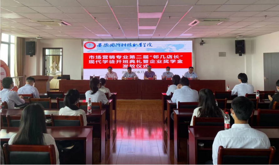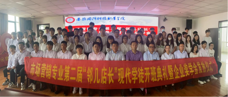 6月9日,beat365在线唯一官网与安徽邻几便利店有限公司共建的第二届“邻几店长”现代学徒制开班典礼暨企业奖学金发放仪式在校秉心楼12楼会议室隆重举行。经贸管理学院党总支书记刘峰、院长杨力、副院长杨学分、安徽邻几便利店有限公司人力资源部部长陈亮、六安分公司人事经理刘思思、六安区域师傅代表杨姜、市场营销专业骨干教师及20级、21级“邻几店长”营销班全体学徒出席开班典礼。开班典礼由经贸管理学院副院长杨学分主持。