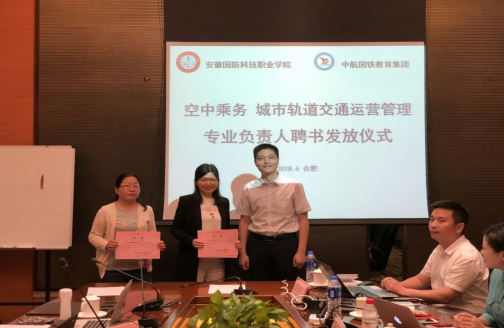 会议由中航国铁教育集团安徽分公司副总经理朱愉快主持。首先,朱愉快介绍了各位与会代表并对经贸管理学院一行人的到来表示欢迎。之后,中航国铁教育集团安徽分公司项目顾问谢蓉介绍了2018级人才培养方案中企业方内容的变动情况,主要涉及到部分企业方负责专业核心课程的更改和授课形式变动情况。紧接着,校企双方根据国家普通高等学校高等职业教育(专科)专业目录及专业简介以及校企办学实际重点对人才培养方案中的职业面向、课程设置、教学进程安排以及教学师资等方面进行了深入探讨。随后,双方就2016级空中乘务专业与城市轨道交通运营管理专业学生第五学期继续学习相关工作展开讨论,并做出安排。会议最后,中航国铁教育集团安徽分公司副总经理为叶高洁和杨彩霞两位专业负责人颁发聘书,希望两位老师积极承担两个专业未来的建设工作。