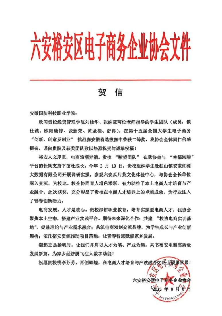 学院长期坚持“以赛促教、以赛促学、以赛促改、以赛促建”,此份荣誉同样凝聚了社会各界的力量,六安聿胜生态农业科技有限公司、六安市裕安区电商企业协会与“幸福淘购”平台等合作伙伴为项目提供了有力保障。赛后,六安市裕安区电商企业协会特致贺信,高度肯定beat365电商人才培养的成效,并表达了共建“校协电商实训基地”的合作意愿,彰显了学校服务地方发展的显著成果。