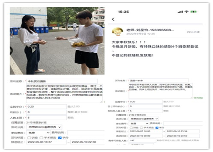 返校第一周正值中秋佳节来临之际,学院高度重视,将温暖和关怀送到学生心里,一块月饼、一袋零食、一句祝福、一次活动,学生们的心紧紧地和学院连在一起,传统佳节的温暖冲淡了初返校园的不适,同学们正养精蓄锐,为新学期线下教学等文体活动做好准备。