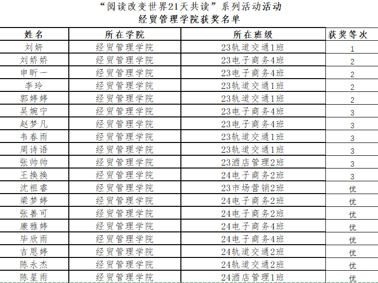 近日,在校图书馆精心组织的2024年“阅读改变世界21天共读”活动中,经贸管理学院同学们积极参与,表现优异,收获了丰硕的成果。