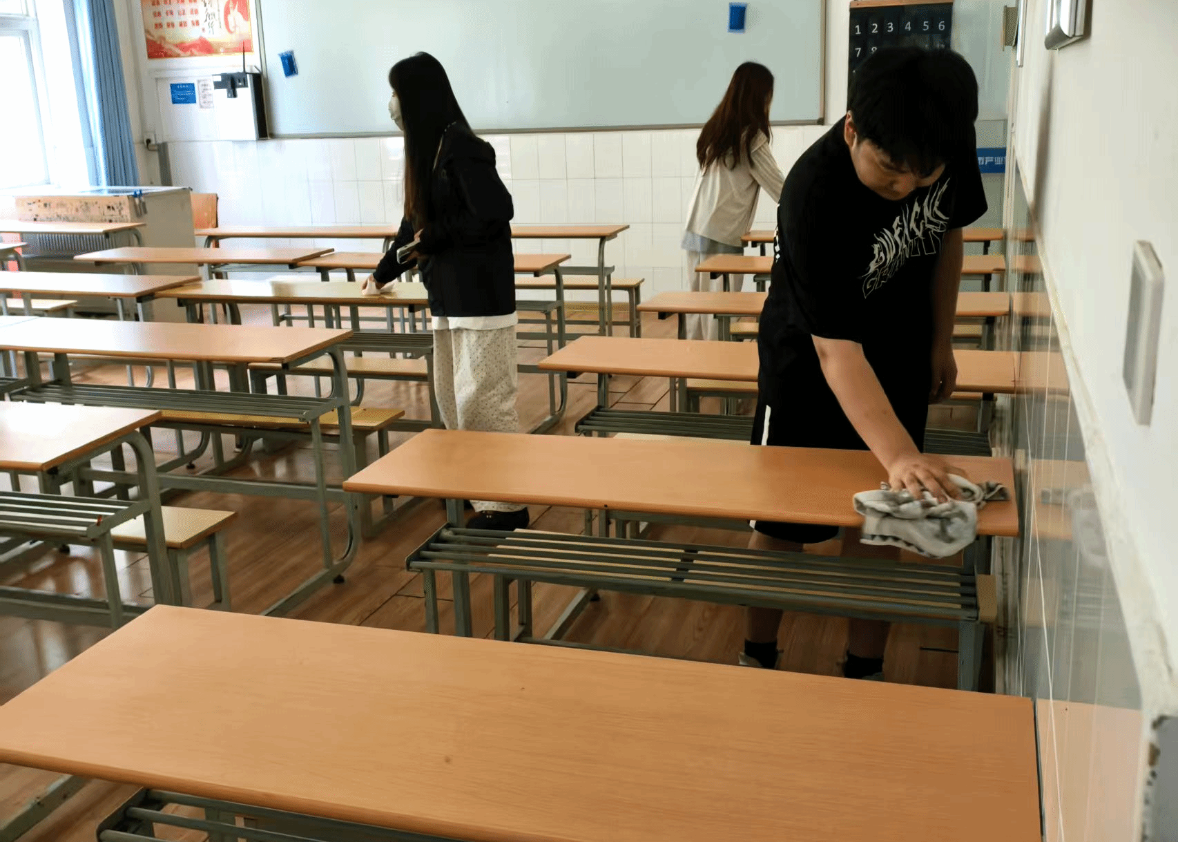 活动当日,参与同学于军工魂广场准时集合,通过扫码完成签到流程后,有序进入教室开展卫生清扫工作。活动现场,同学们分工明确、配合默契,有的手持扫帚清理地面垃圾,有的拿着抹布擦拭桌椅黑板,不放过任何一个卫生死角,以严谨认真的态度践行爱beat365园的共同理念。