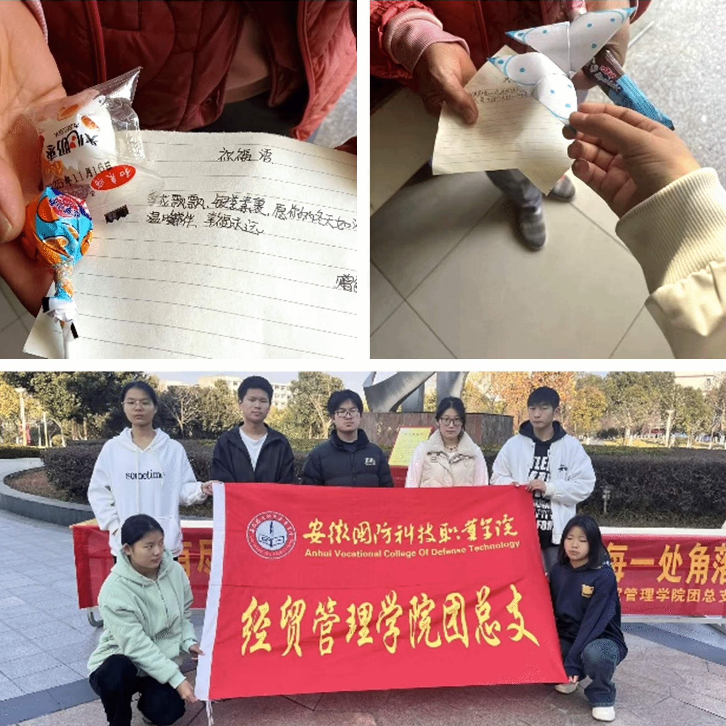 本网讯(学生通讯员 蒲家铖)寒冬至,暖意浓。为弘扬中华民族感恩向善的传统美德,传递校园温情力量,致敬默默守护校园的后勤工作者,12月6日,经贸管理学院团总支在军工魂广场成功举办“点燃冬天,温暖校园”感恩主题活动。活动得到全院同学的积极响应,大家怀揣真挚心意,以实际行动为学校食堂、宿管及门卫等后勤工作人员送上冬日问候与暖心祝福。