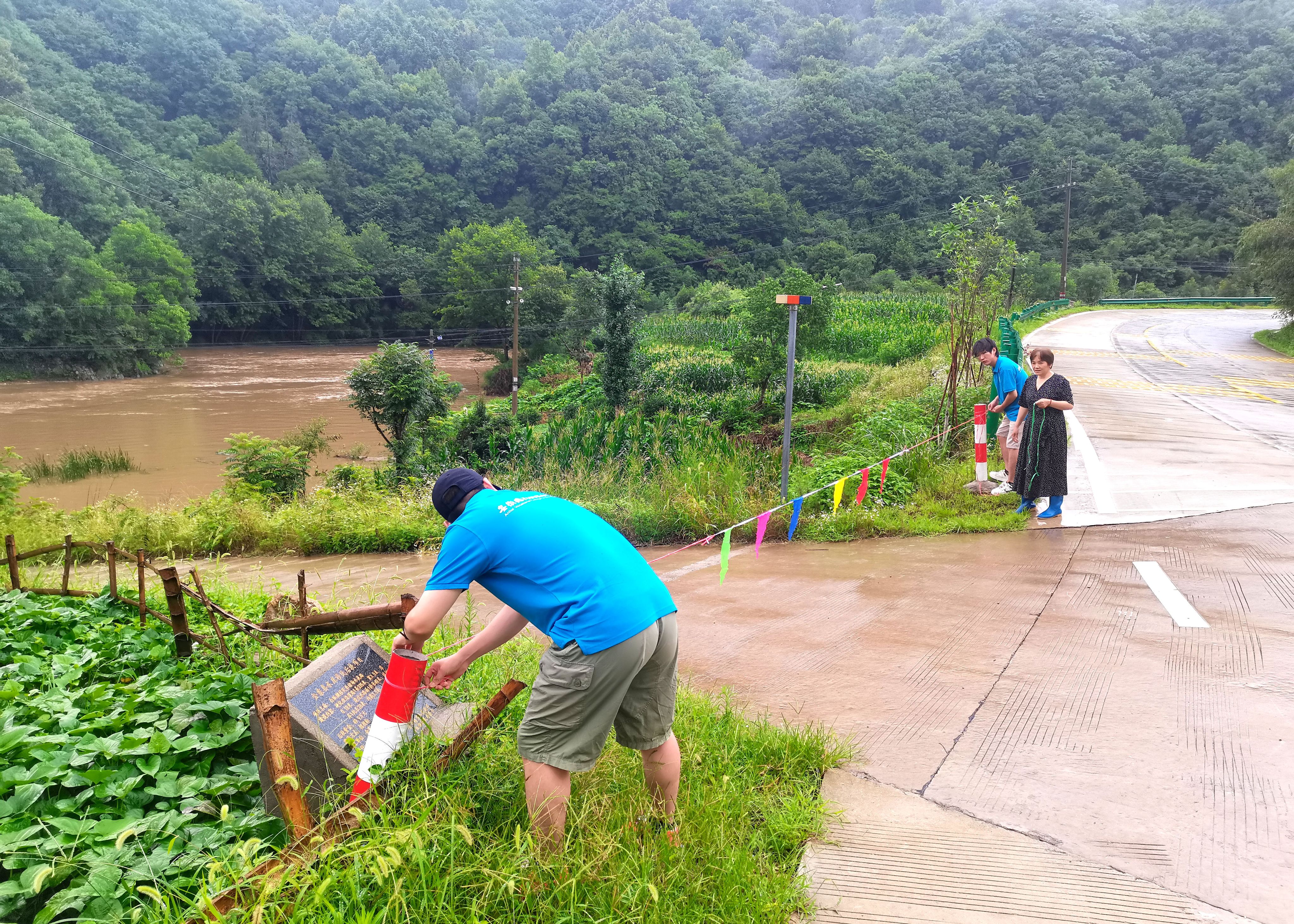 实践活动后期,天气骤变,大雨滂沱。根据相关政府工作部署,白纸棚村委会全体工作人员积极行动全力以赴投入到防汛工作中,转移安置辖区地质灾害隐患点周边居民。结合实际情况,在确保安全的基础上,团队成员在带队老师的全程指导下,积极协助村委会开展防汛减灾宣传工作。队员们在村委会工作人员安排下,在辖区防汛重点区域全面设置防汛安全提醒标识,有效提升了村民的防灾减灾意识,为乡村安全筑起了一道坚实的防线。