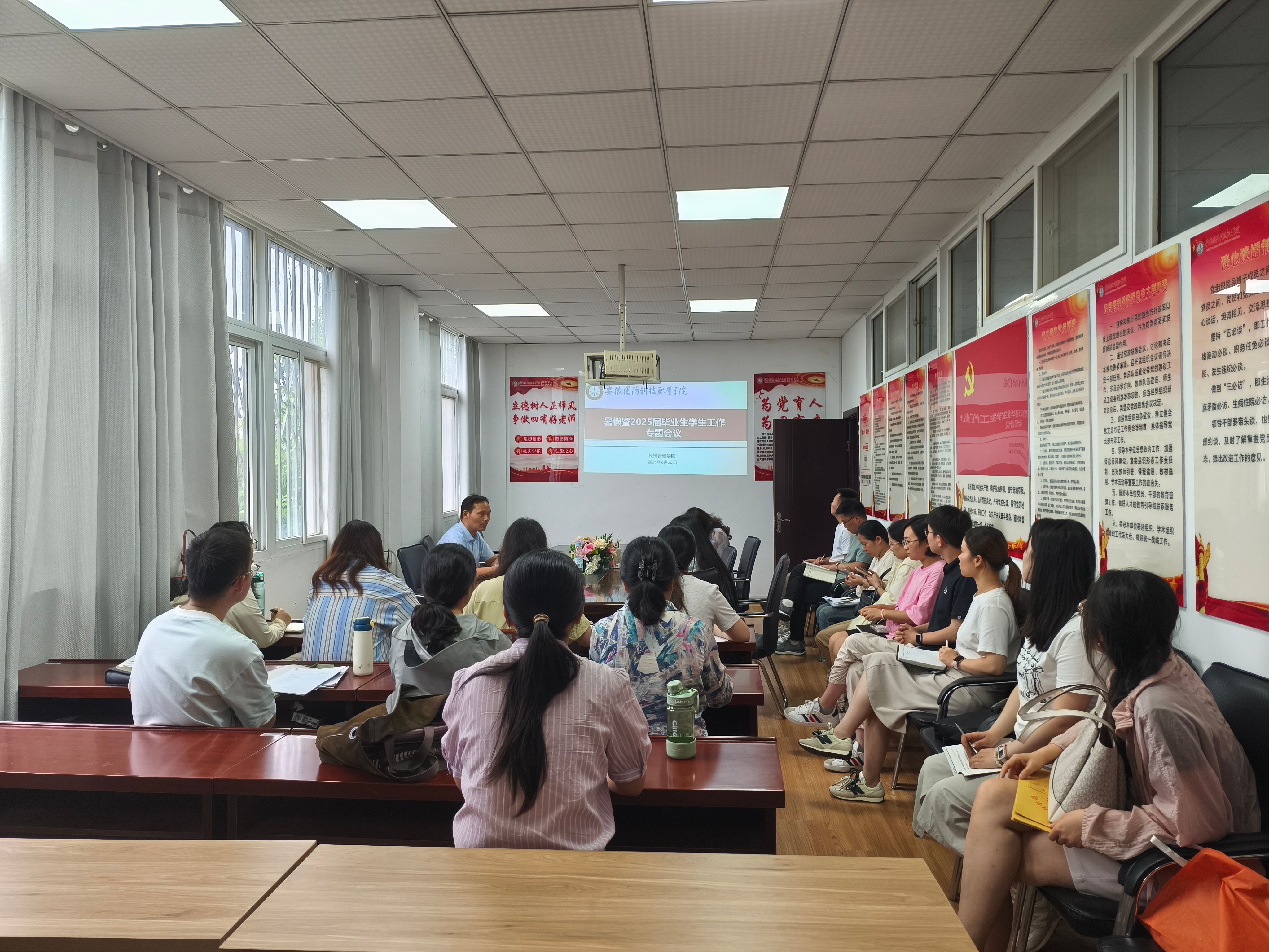 为扎实推进期末各项学生工作,筑牢安全防线,高效做好毕业生服务,6月25日,经贸管理院召开暑假暨2025届毕业生学生工作专题会议。会议由学院党总支书记刘峰主持,全体辅导员参会。