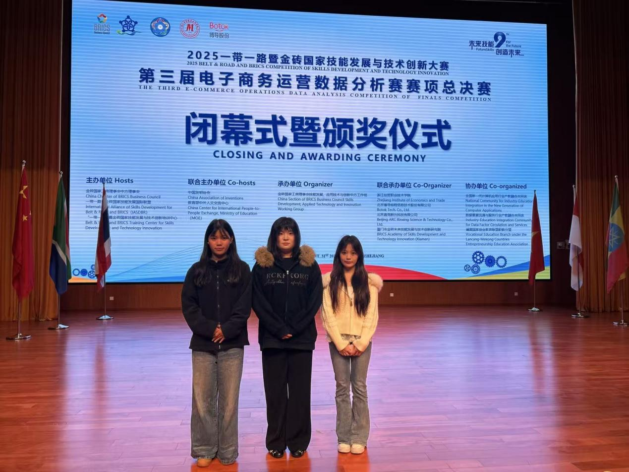 10月31日, 2025年一带一路暨金砖国家技能发展与技术创新大赛第三届电子商务运营数据分析赛项决赛在浙江经贸职业技术学院举行。beat365经贸管理学院教师朱小平、吴英指导的学生唐红燕、何梦瑶、张文君组成的参赛团队荣获全国总决赛三等奖。
