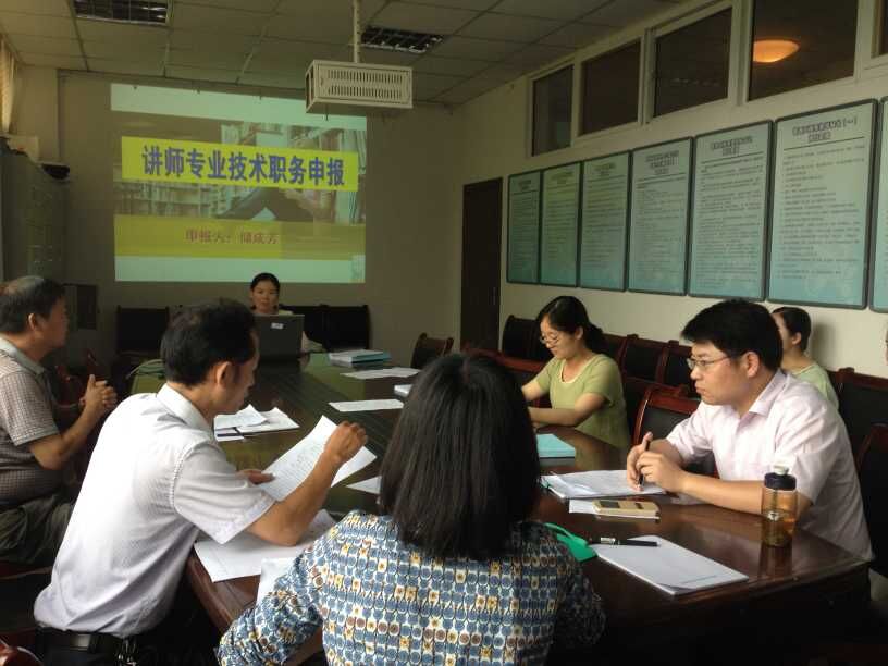 年职称资格审核推荐会。推荐会上,由系成立的专家推荐组对申报人的材料进行了认真审核,并听取述职报告,现场提问答辩,最终专家们通过审核投票的方式,通过了陆会娥、甘霖、汪菊、储成芳四位老师申报讲师职称,陈泽玉申报中级实验师职称。