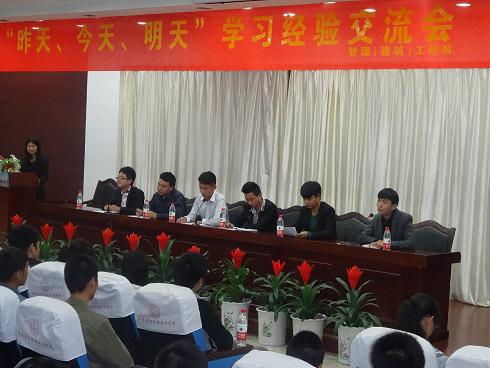 10月20日下午,管理建筑工程系学生会在图书馆报告厅举办以“昨天、今天、明天”为主题的学习经验交流会。院学生会主席刘军、系学生会主席刘稳、心理协会会长王鹏、营销策划协会会长焦潇潇、参加技能大赛获奖者宋政、优秀实习生代表钟衡出席交流会,13级新生参加会议。会议由省演讲比赛一等奖获得者蒋梦霞主持。