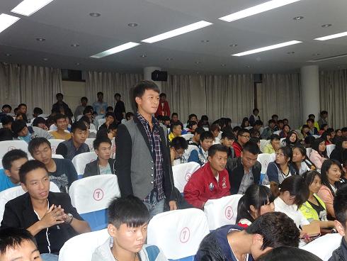报告厅座无虚席,刘军首先结合个人经历与新生们分享了自己一年来的大学生活、经验体会;刘稳向大家介绍了我系现状及学生会工作;王鹏从大学生心理方面向大家谈了大学与高中生活的区别,并分享了如何更快适应大学生活,如何处理好与老师、同学之间的关系;焦潇潇向大家阐述了协会在大学的重要作用,并介绍了营销策划协会近年来取得的成绩;宋政在轻松气氛中与大家谈了大一参加省赛时的酸甜苦辣;钟衡作为实习生代表用亲身经历告诫大家只有珍惜现在才能创造未来。最后提问环节场面更是积极、火爆,犀利的问题,从容的作答,无一不显示出当代大学生积极风貌。整场交流会持续近3小时。