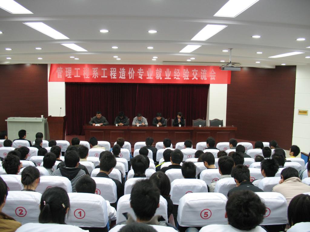 3月21日上午,管理工程系金牌造价协会举办了“工程造价专业就业经验交流会”,会议由系党总支书记杜先扬主持。会议分为两个阶段,集中交流和分组交流。第一阶段在在院图书馆2楼报告厅召开进行。会议首先由分别来自安徽振兴集团的张莹莹、安徽工业工程设计院的周晓龙、安徽华业建安公司的徐飞、中铁四局的冯广栋四位07工程造价专业的同学就本职工作、造就专业知识的应用与学习,工作中的态度和方法,人际关系的处理等方面与大家进行了交流。随后,系主任张显国就专业建设和发展前景进行了发言,并给同学们提出了学习要求。造价专业指导老师梅耀辉在会上也就本专业的学习进行了发言。会议第二阶段在2号教学楼308教室进行。交流中,同学们针对感兴趣的问题找相应的同学进行交流,从而使经验的传达更具有深入性和针对性,使整个交流会氛围达到了高潮。